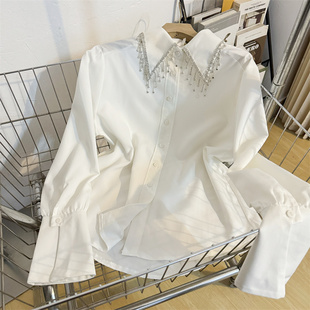 上衣 轻奢别致喇叭长袖 白色重工流苏钉珠衬衫 女2024秋冬设计感法式