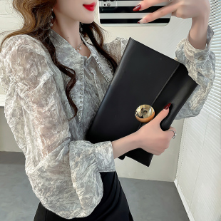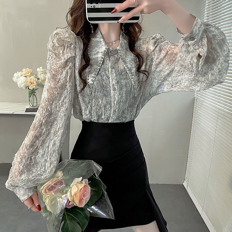 2024早春高级感重工钉钻尖领衬衫 衬衣女 女气质雪纺亮丝上衣泡泡袖