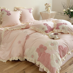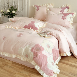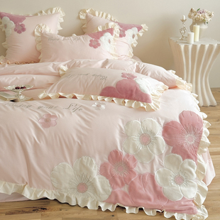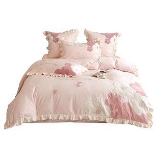 ins粉色可爱公主风全棉床上四件套纯棉刺绣花朵被套床单女孩床品4