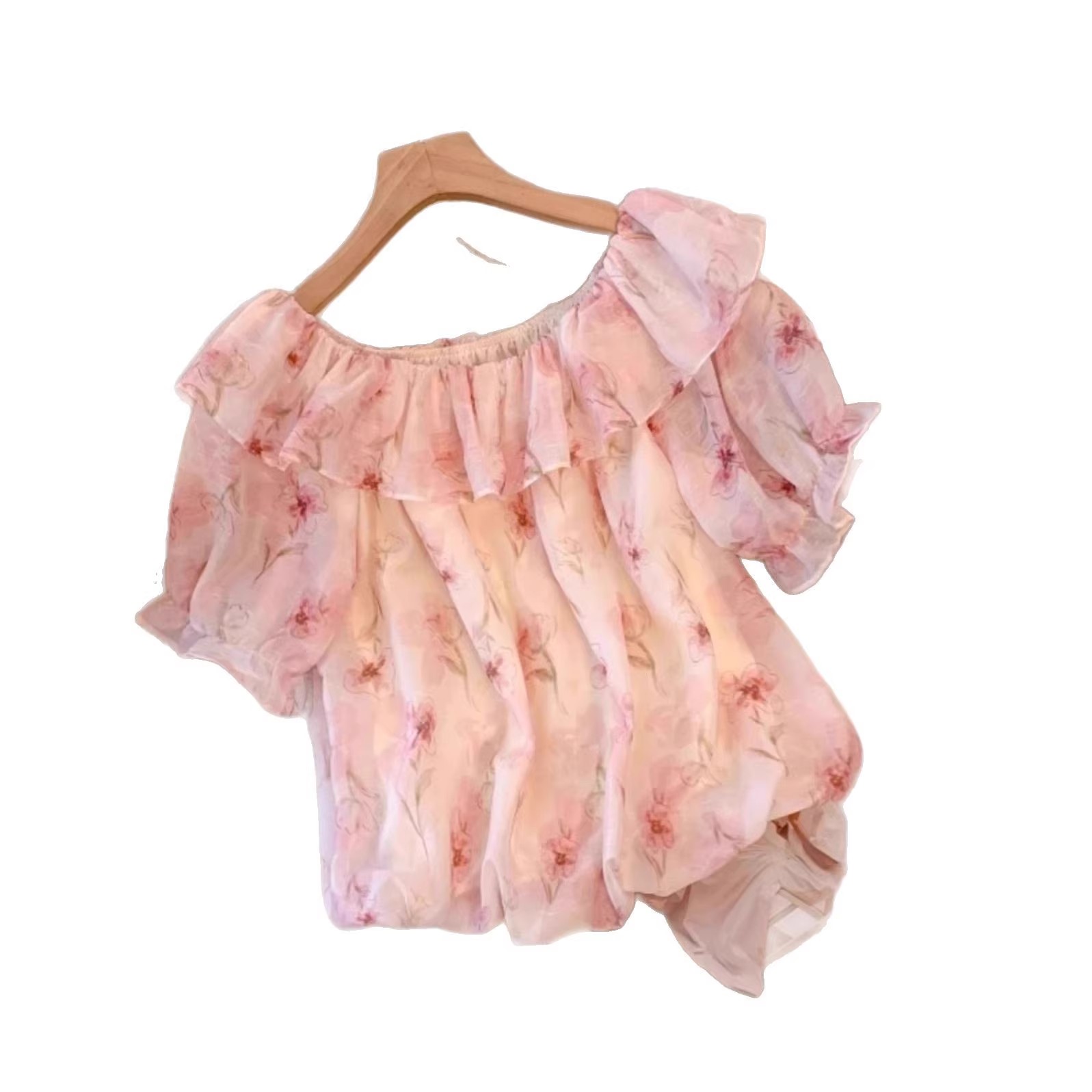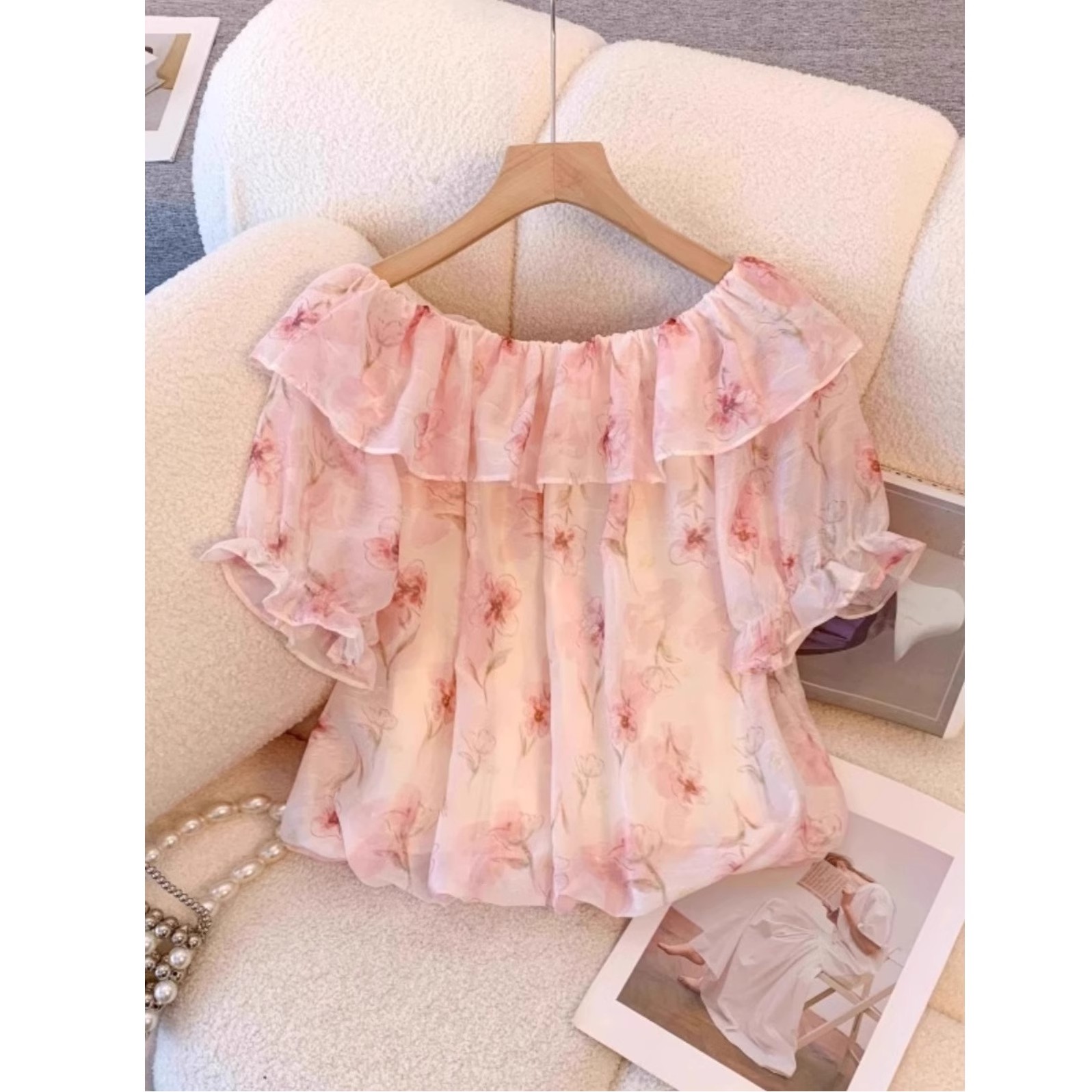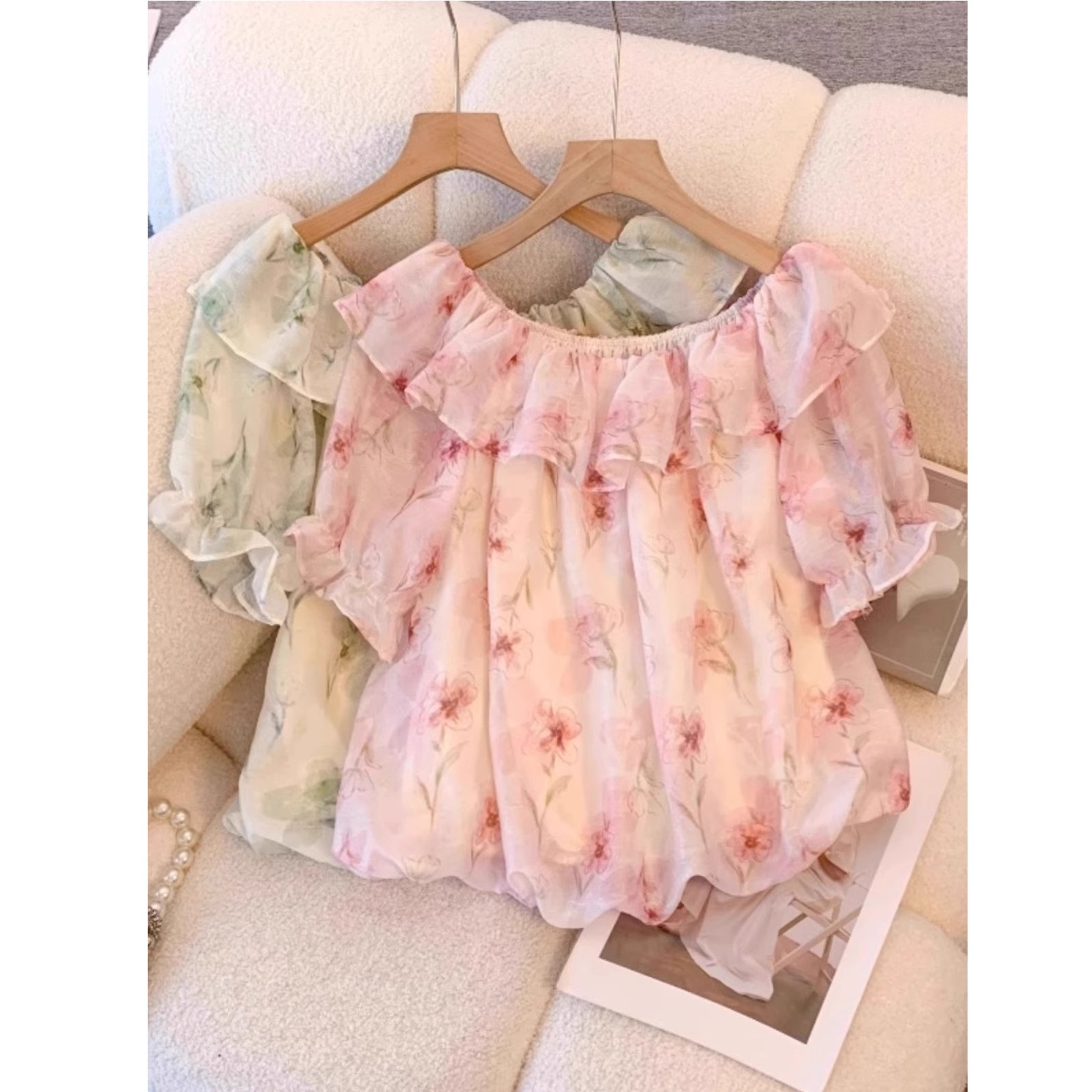 女显瘦碎花荷叶边超火小衫 胖mm宽松大码 短袖 衬衫 上衣潮 雪纺泡泡袖