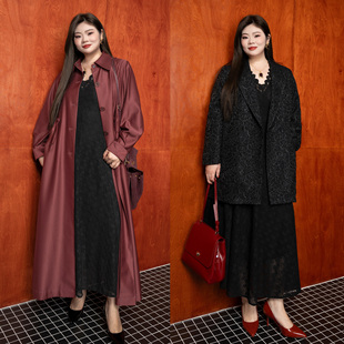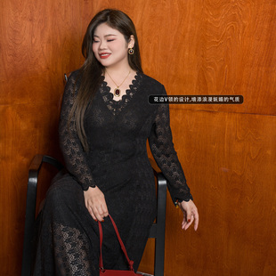 美丽客栈原创高端大码 遮肚显瘦胖mm200斤V领黑色蕾丝连衣裙 女装