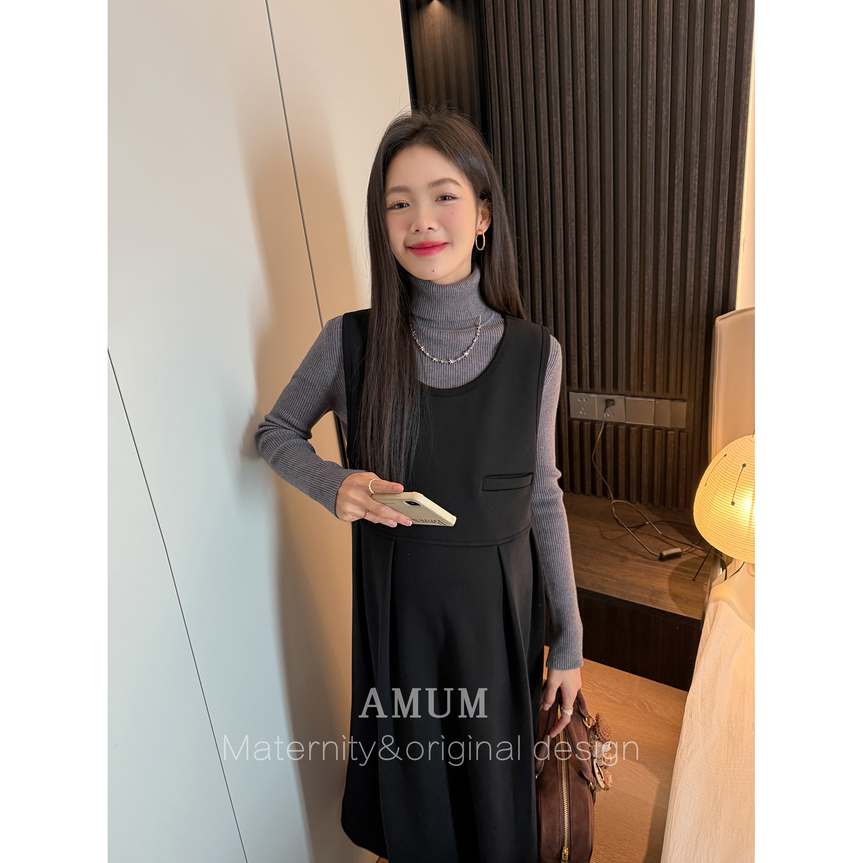 复古圆领黑色无袖 法式 秋冬叠叠乐 加绒休闲背心裙 AMUM孕妇装