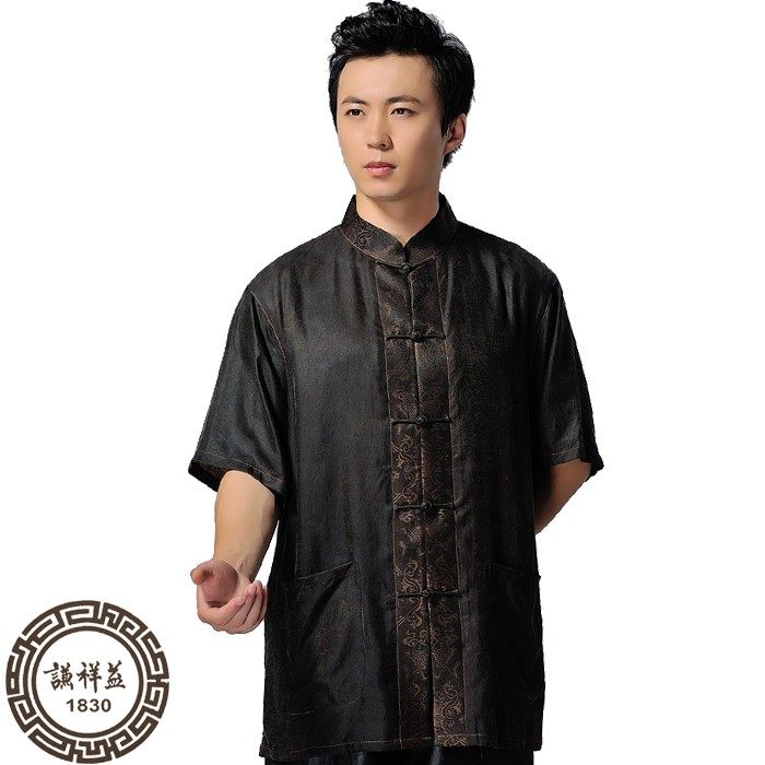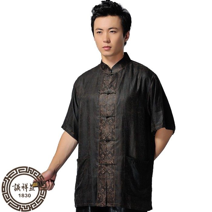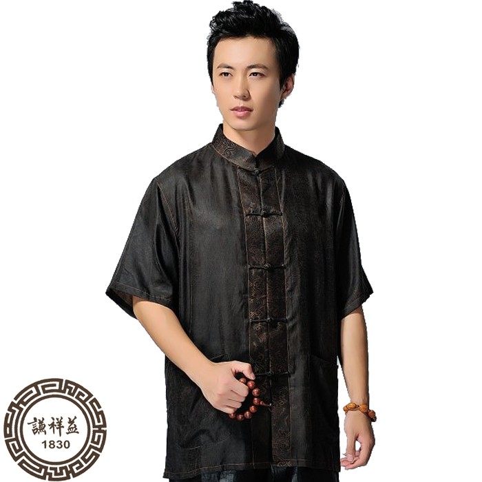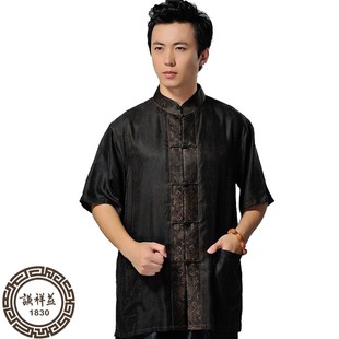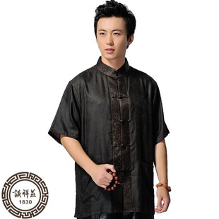 中国风盘扣真丝上衣民族风复古衬衫 中式 男短袖 香云纱唐装 立领夏装