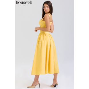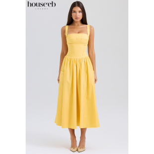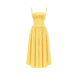 复古文艺风方口领吊带杏色棉质太阳裙 Vivien House
