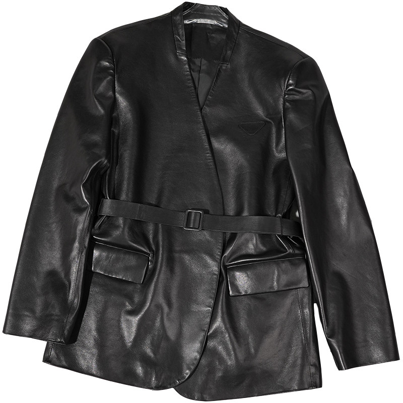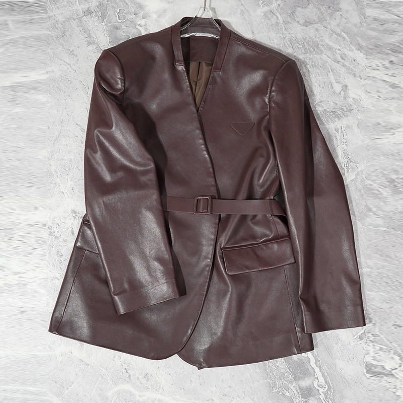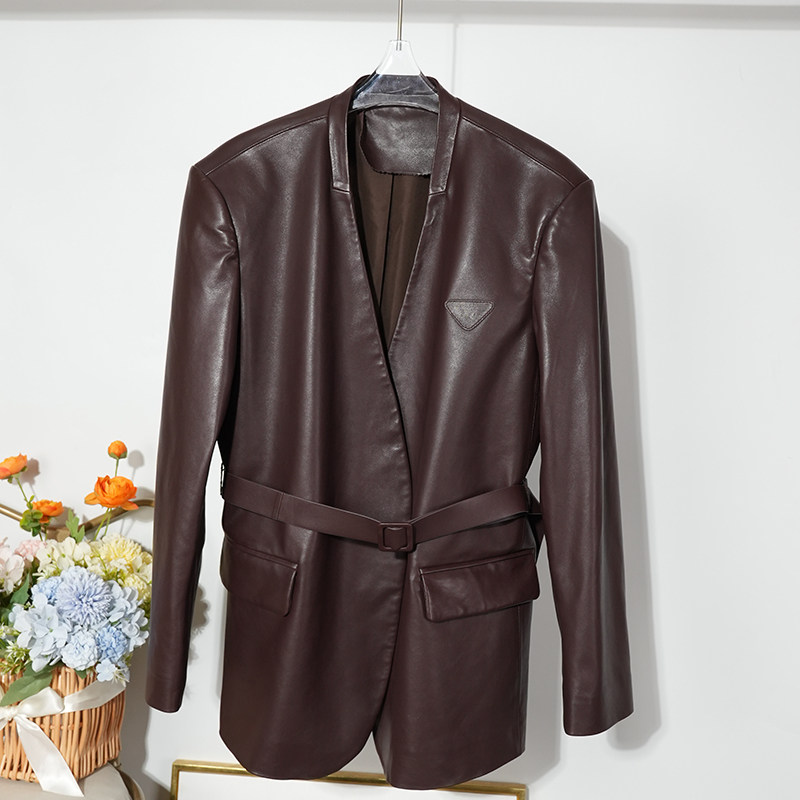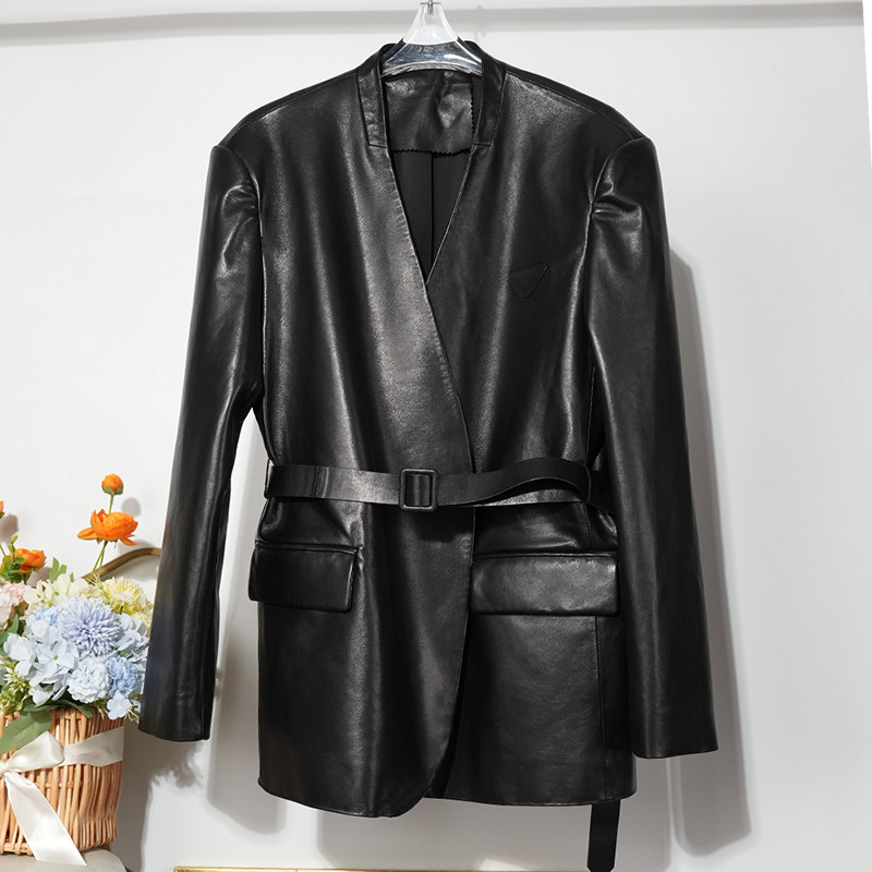 头层真皮皮衣女2026秋高级感V领系带收腰中长款 绵羊皮外套 小西装