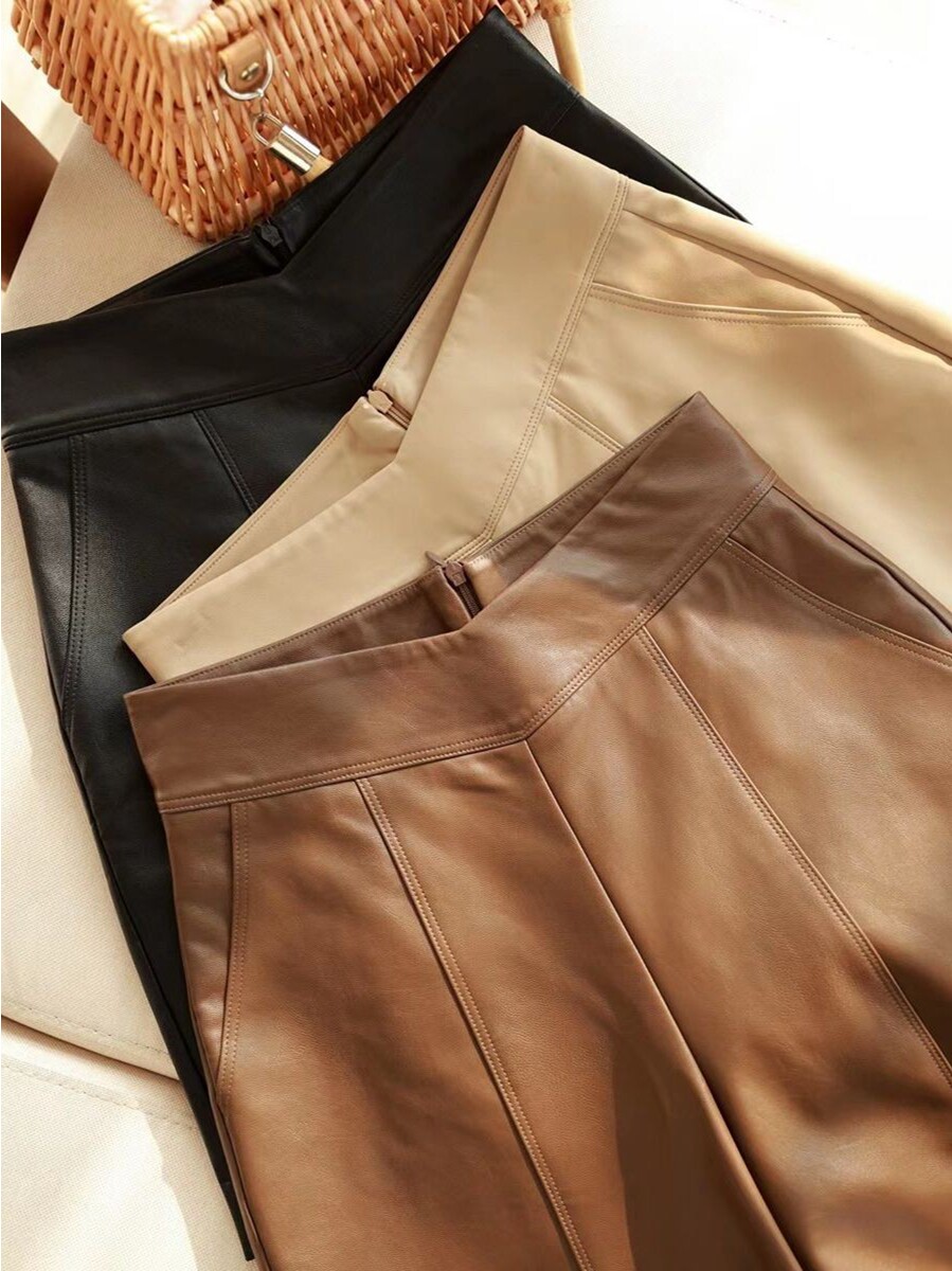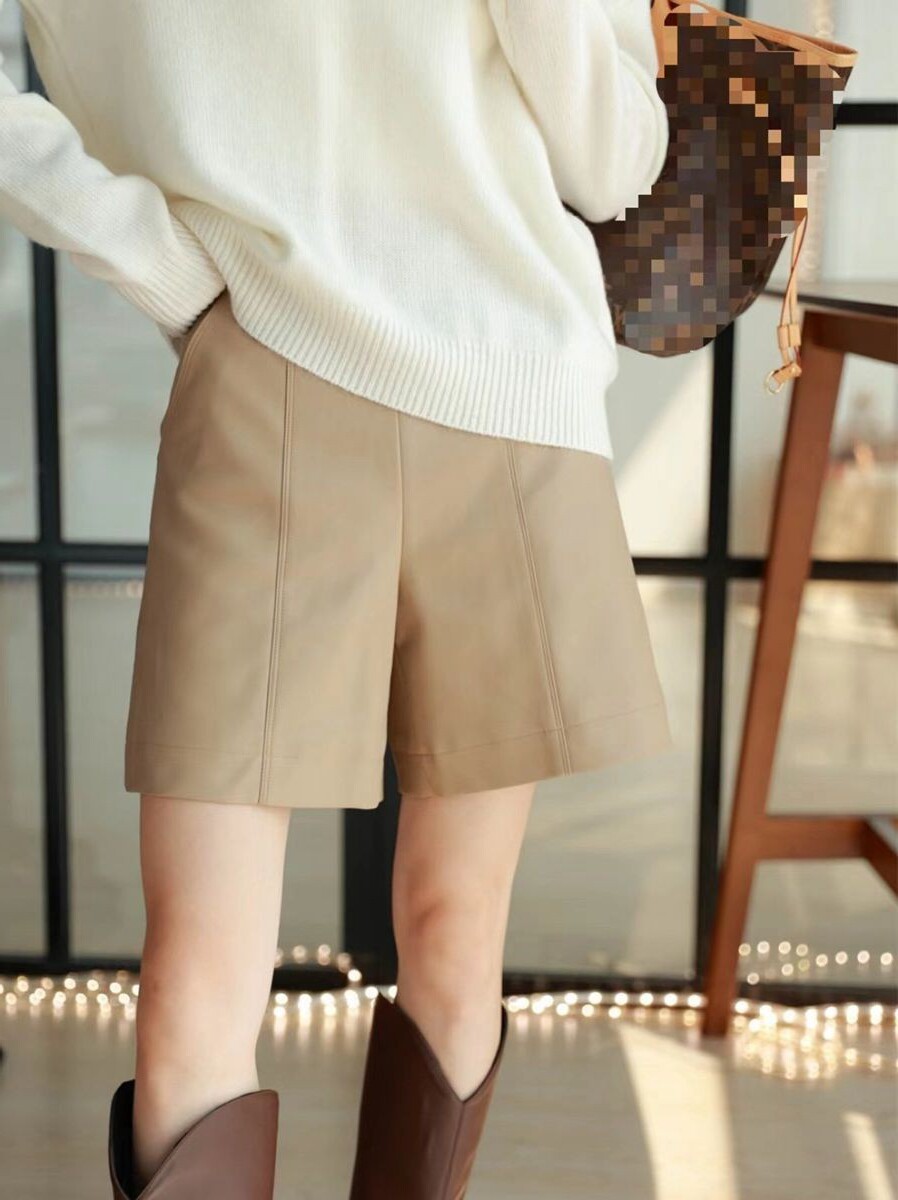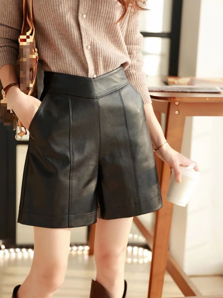 休闲五分裤 女中高腰直筒显瘦皮裤 潮 清货阔腿绵羊皮真皮皮裤 特价