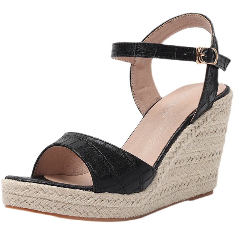 露趾防水台扣带草编麻绳底女鞋 坡跟厚底高跟凉鞋 百搭 夏季 2022新款