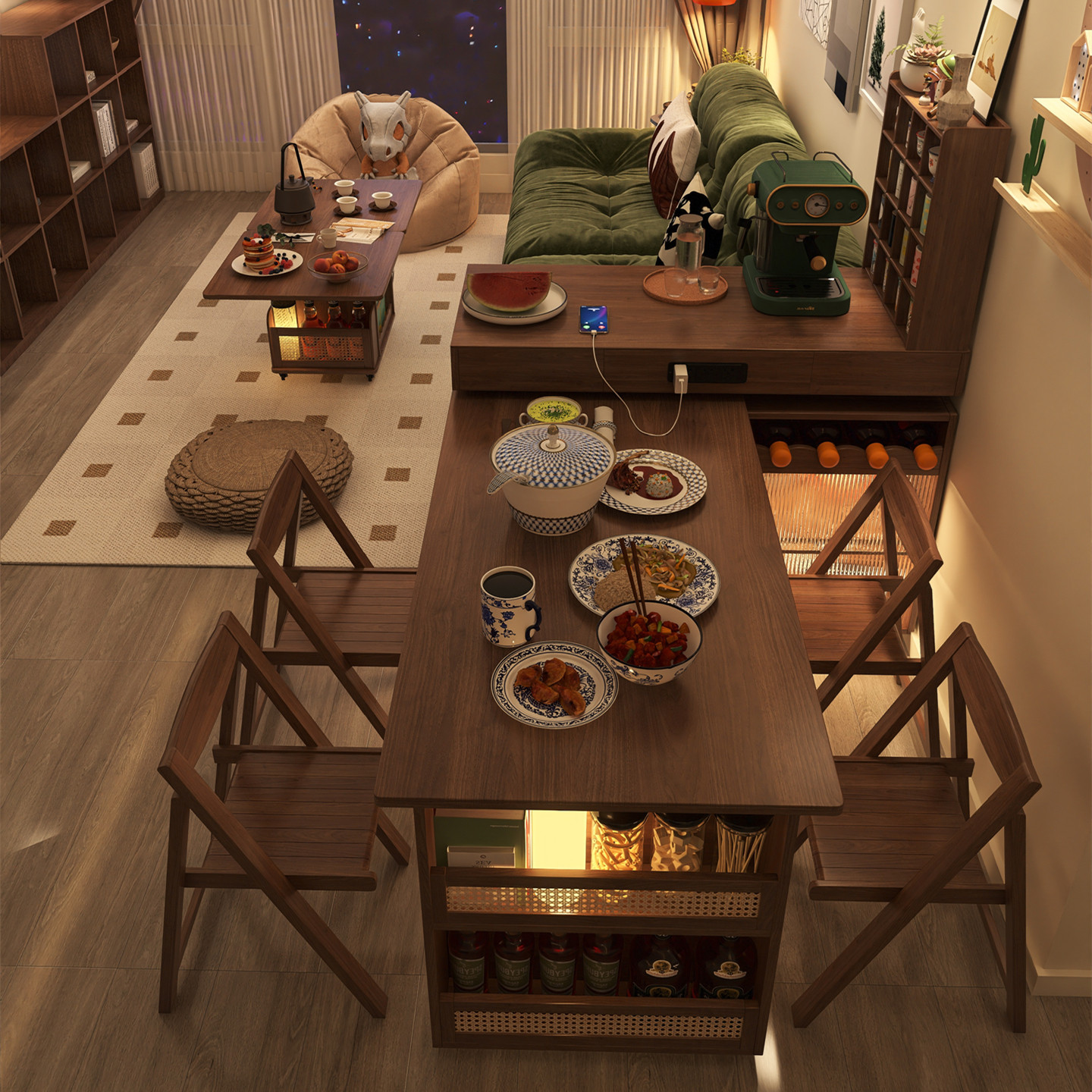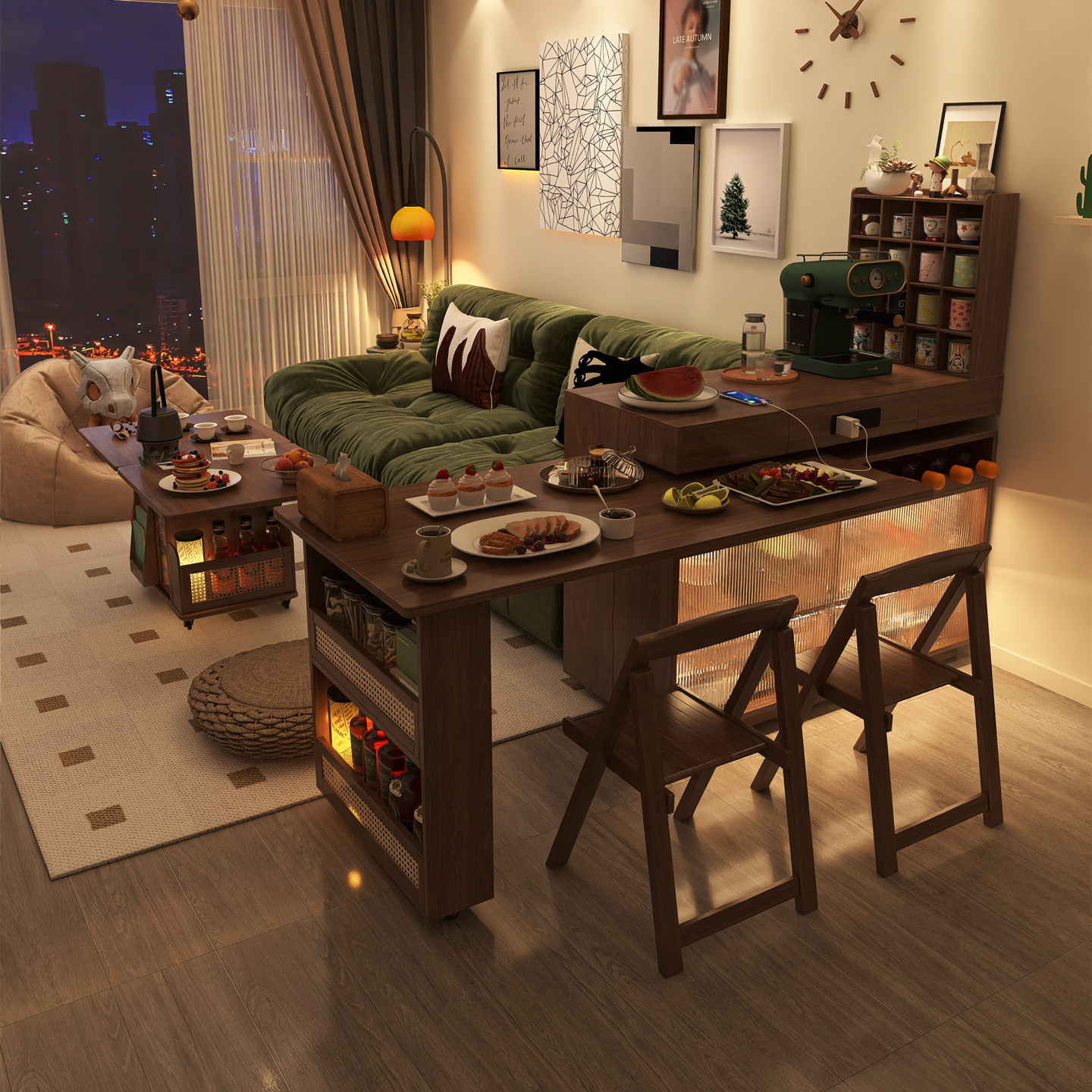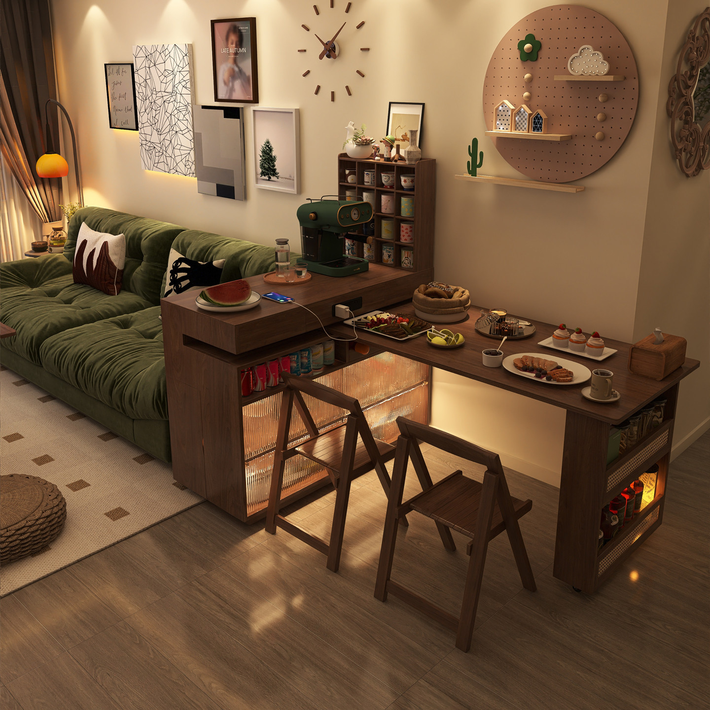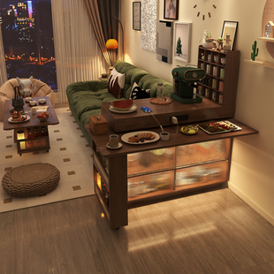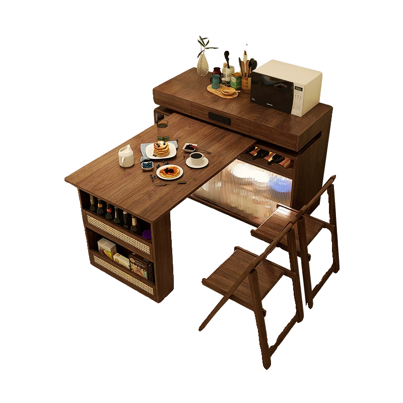 下挂岩板岛台餐桌一体可伸缩家用中古风胡桃色开放厨房餐厅中岛台