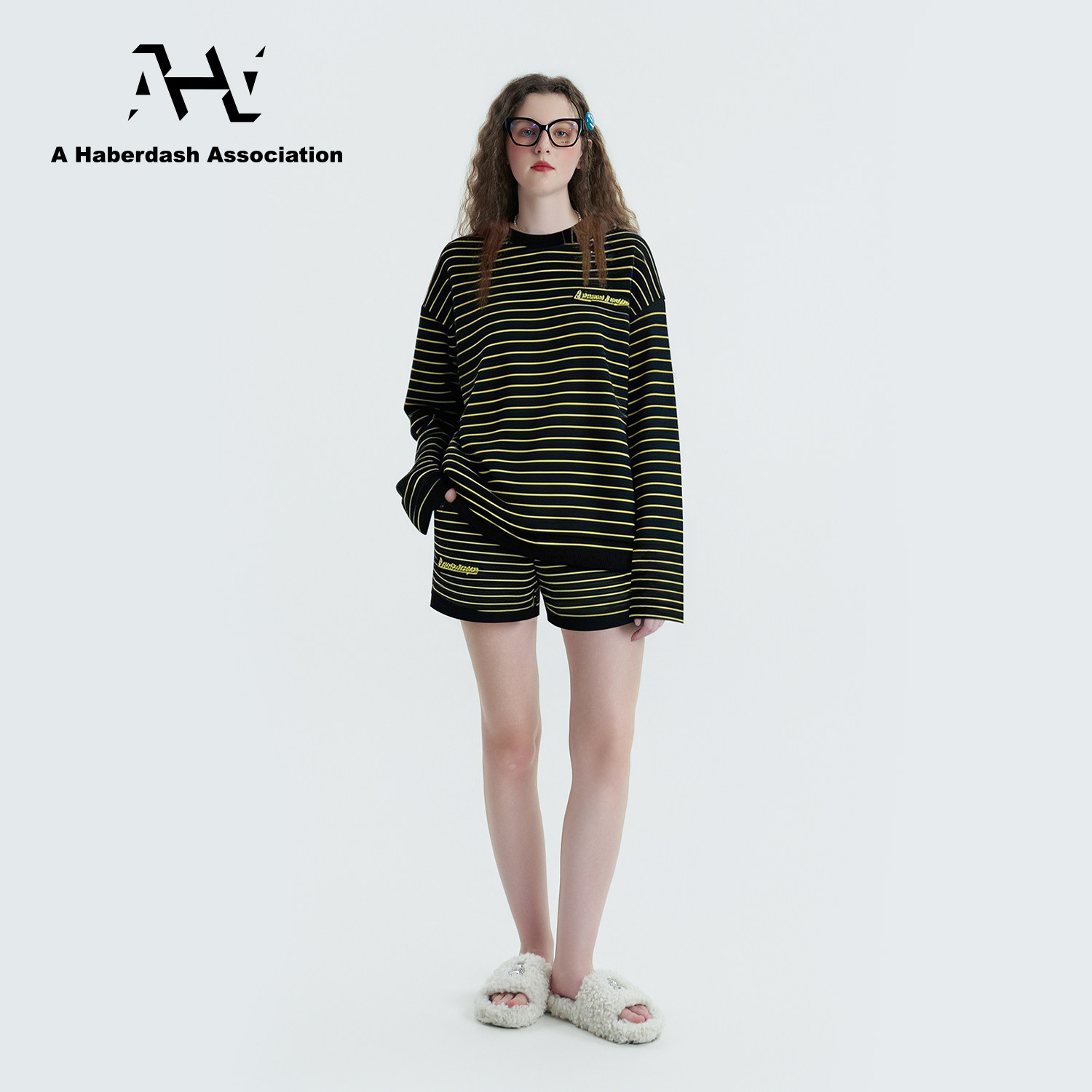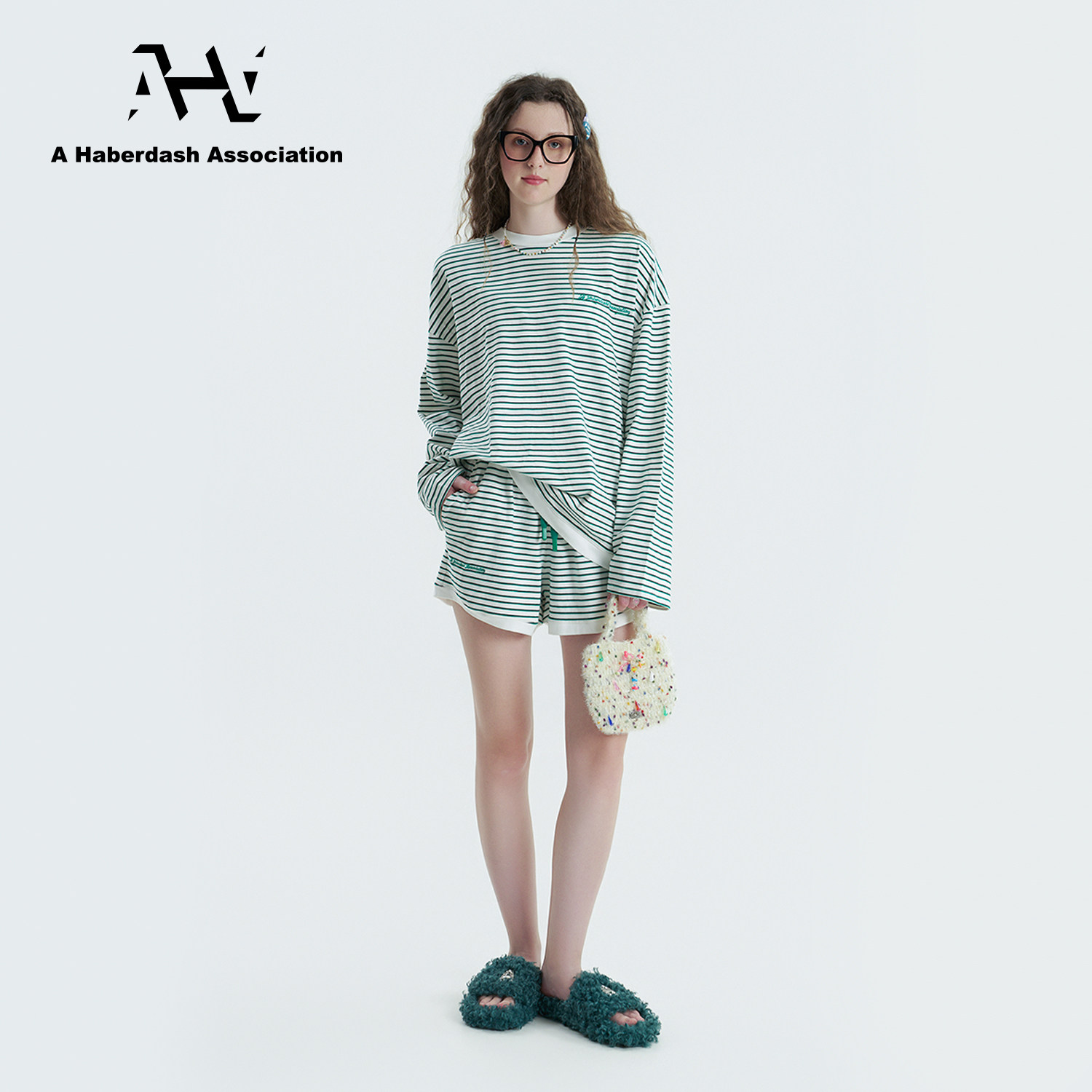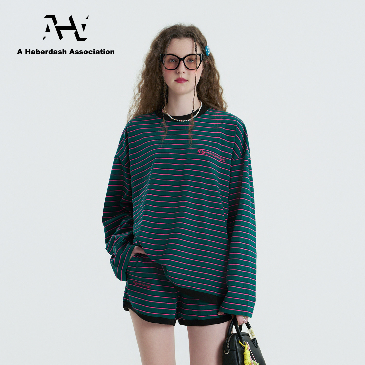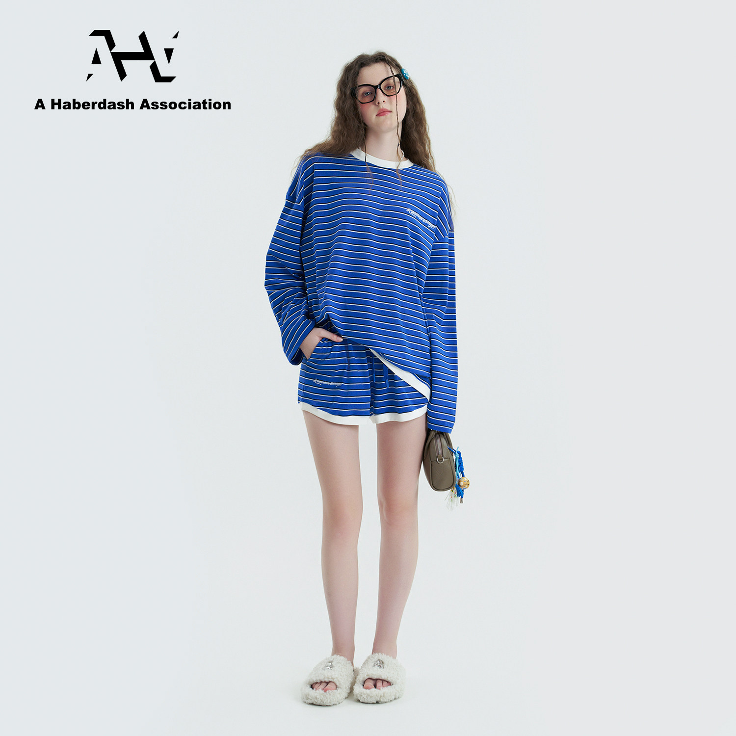 慵懒两件套装 AHA爱侈艾· 短裤 条纹刺绣长袖 徐艺洋宋亚轩同款