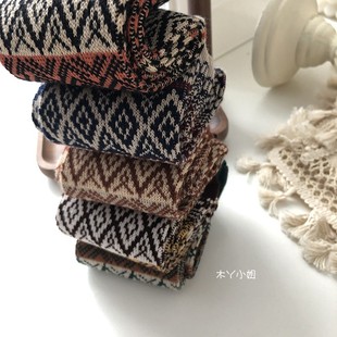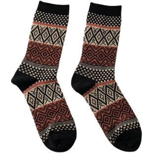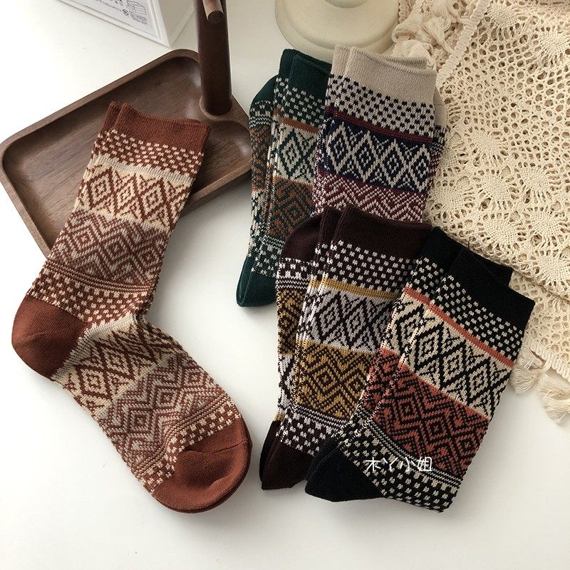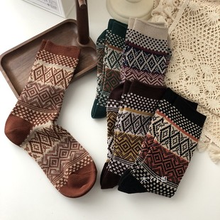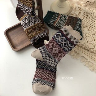 清雅 秋冬复古菱形格袜子女英伦风ins潮堆堆袜文艺双针双路中筒袜