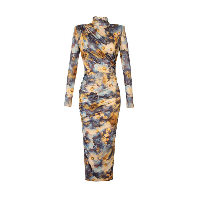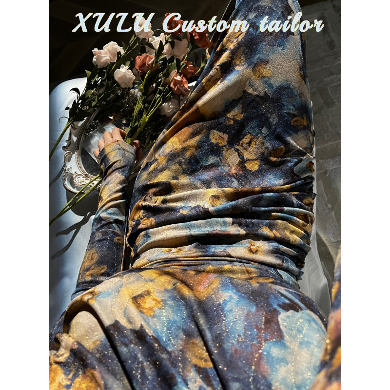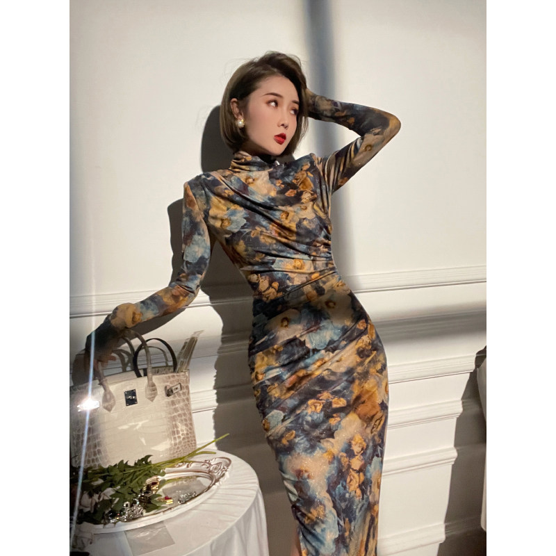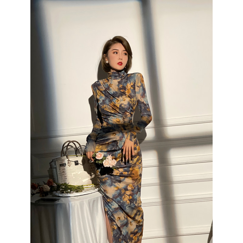 XULU原创轻奢网纱复古印花气质收腰显瘦古典风高领长袖 连衣裙
