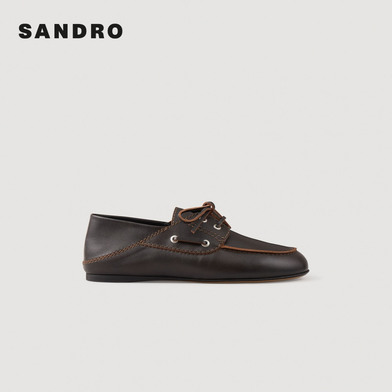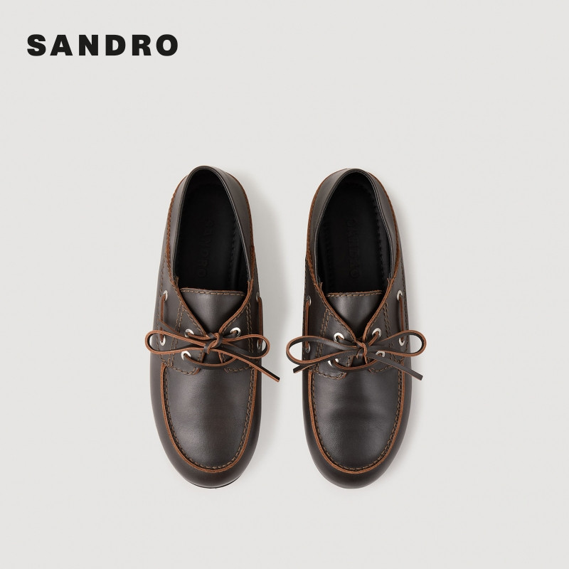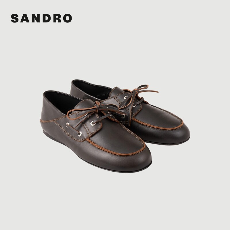 皮鞋 牛皮革棕色系带平底乐福鞋 末6折SANDRO2025秋冬女士法式 季