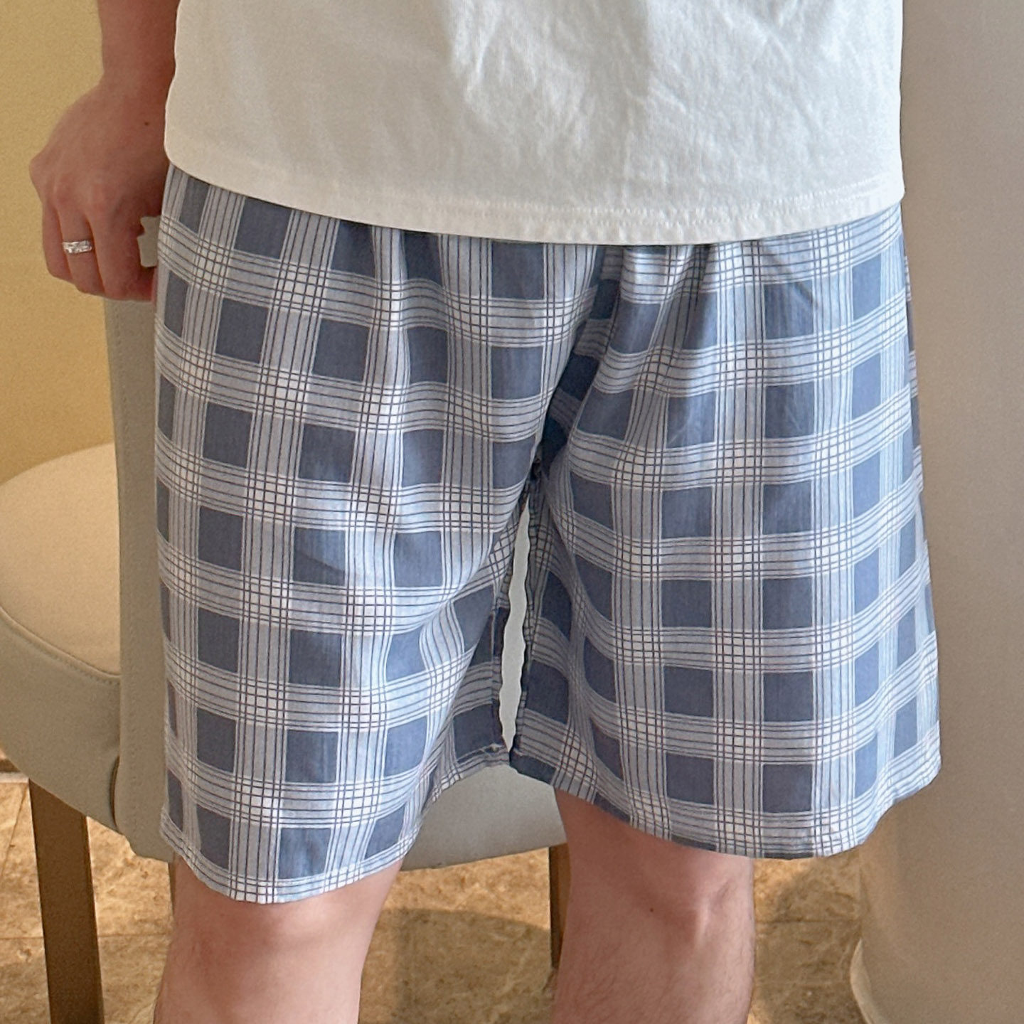 百搭日系男士 五分家居裤 夏季 棉绸宽松人造棉沙滩短裤 睡裤 格子男款