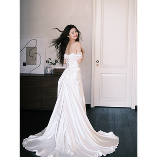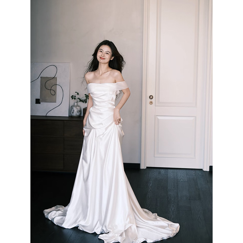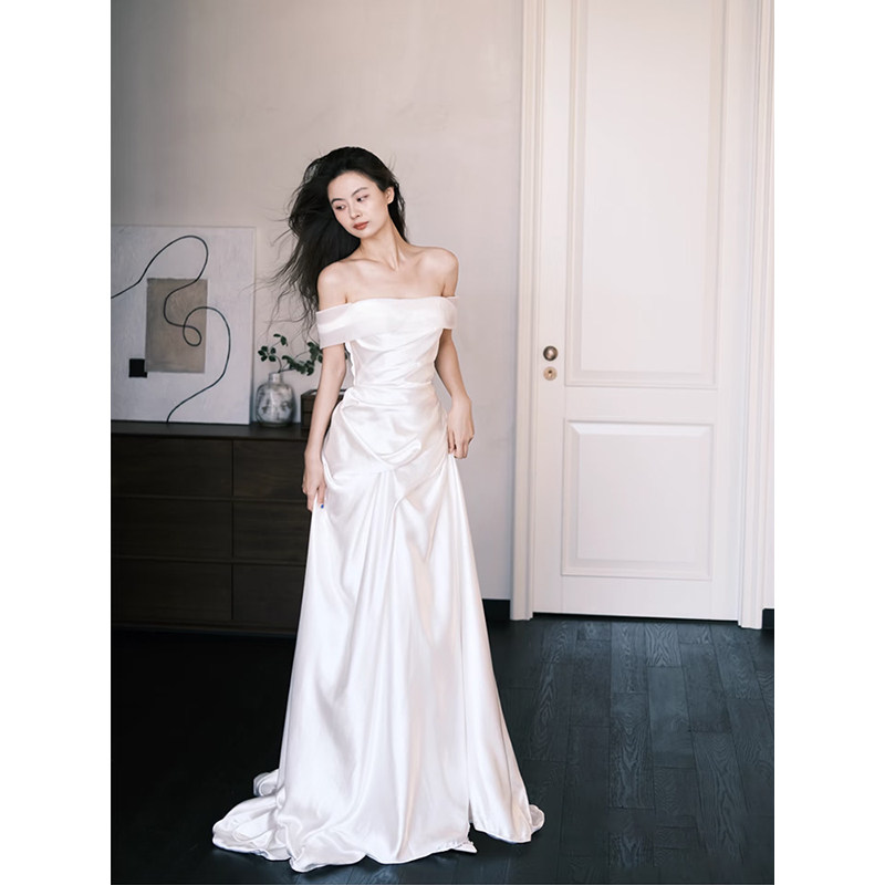 法式 高级感简约缎面轻婚纱出门纱一字肩气质新娘超仙迎宾礼服裙