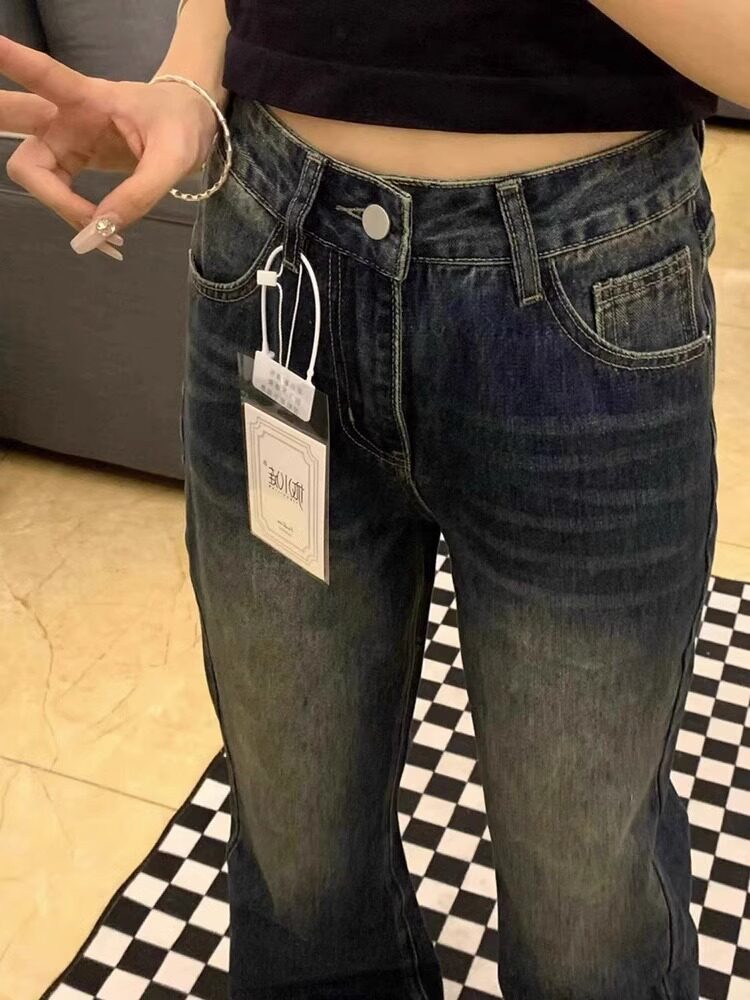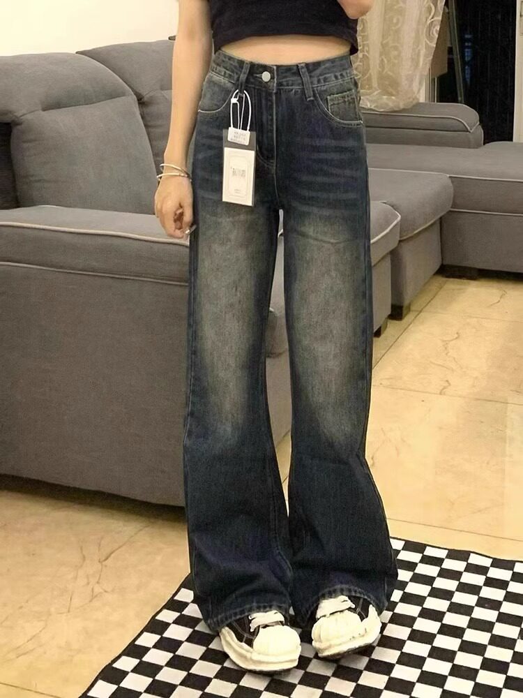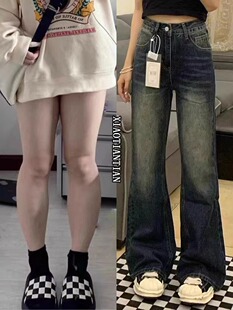 女直筒春秋高腰显瘦梨形身材阔腿裤 浪潮大码 胖mm复古微喇叭牛仔裤