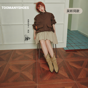 拼接褶皱西部堆堆靴骑士靴 靴子女长筒靴2025新款 真皮 马思纯同款