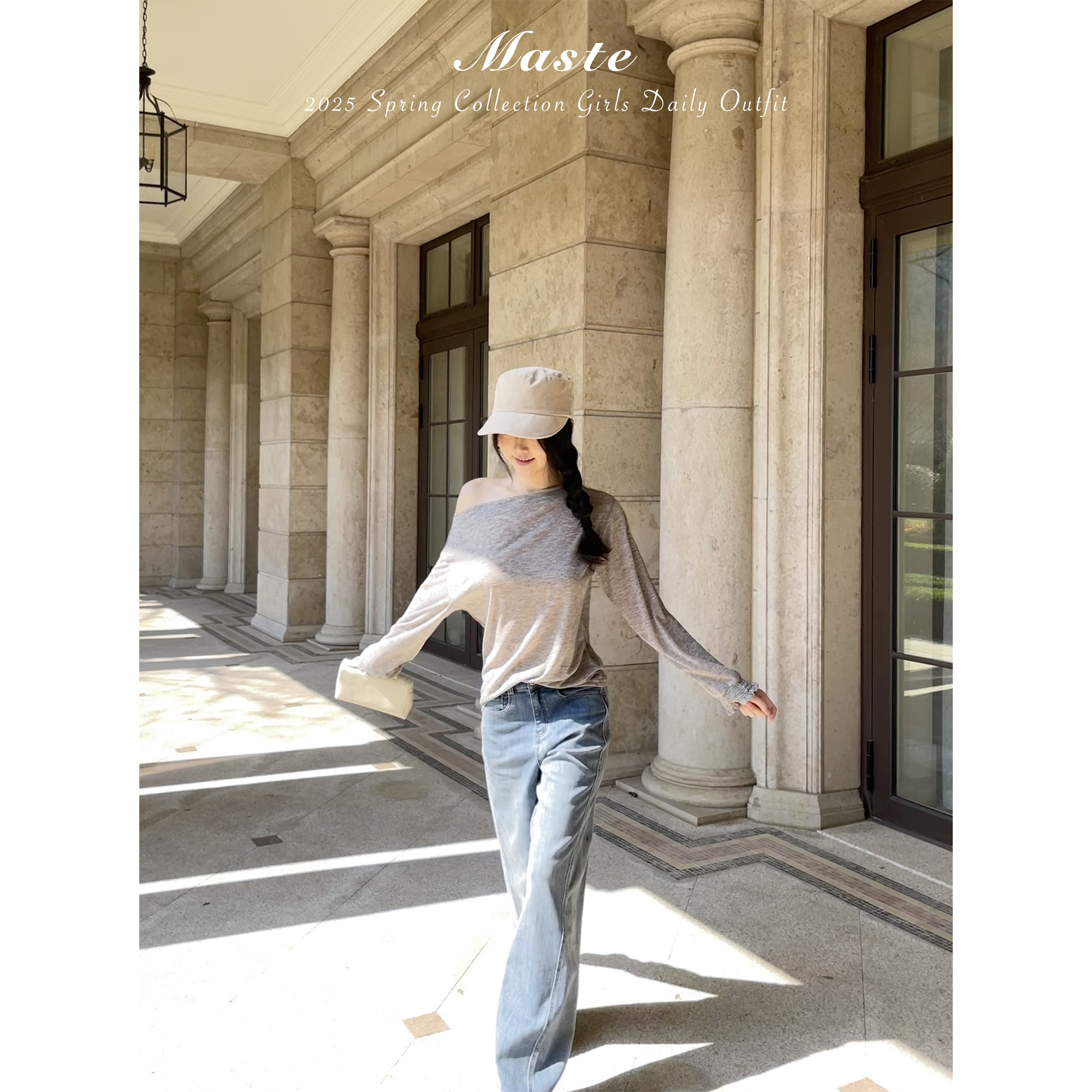 MASTE 天丝松弛慵懒花灰色斜肩上衣 倔强巴黎