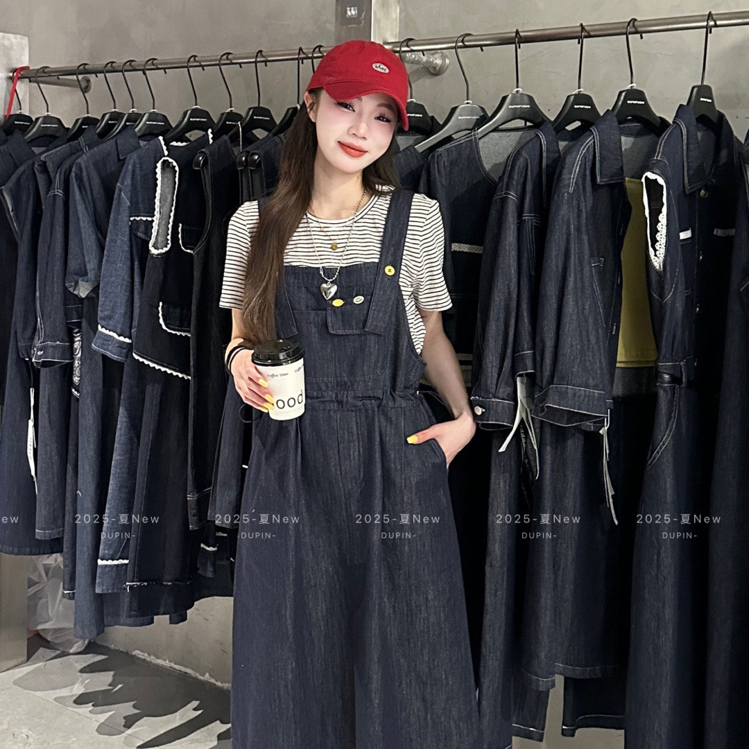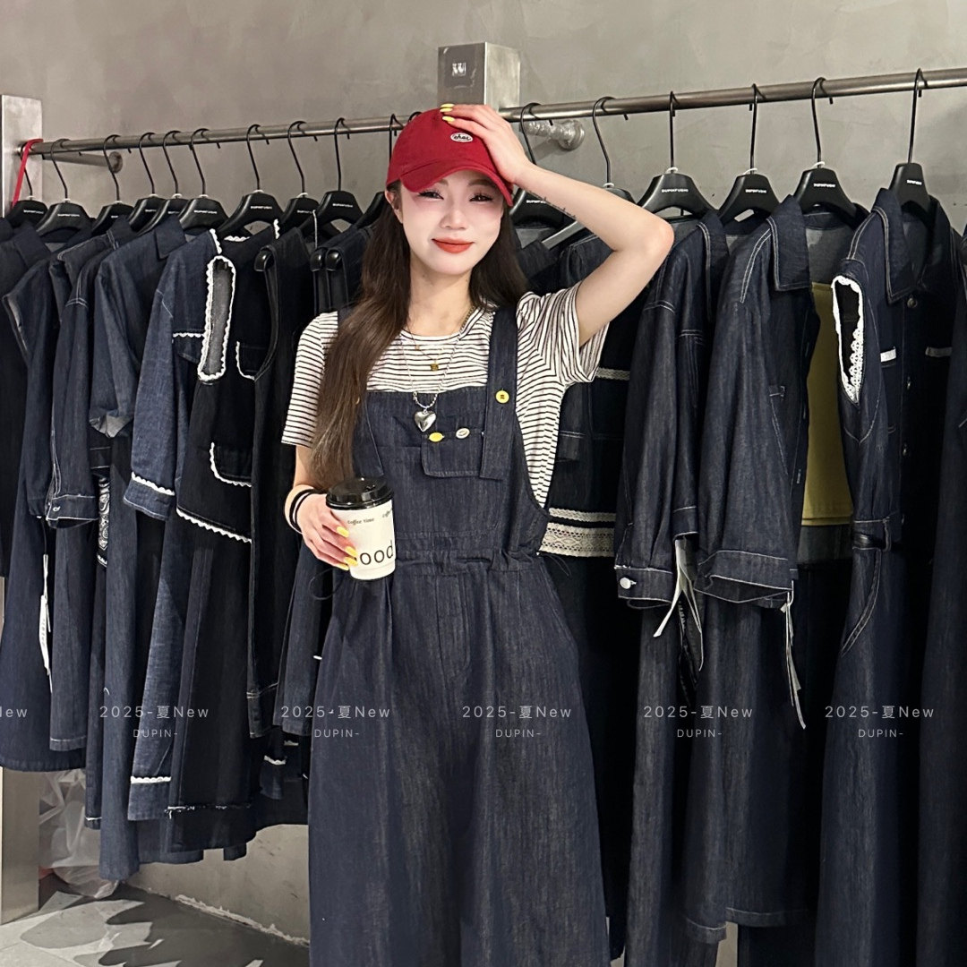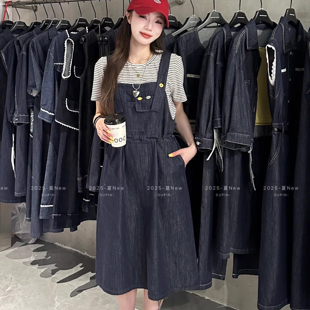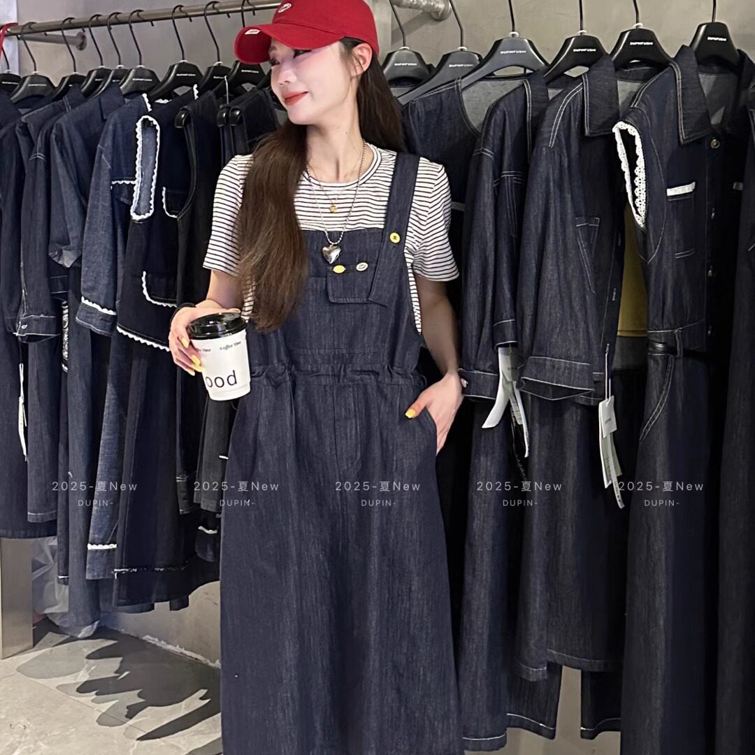 T恤牛仔背带裙抽绳收腰显瘦两件套女夏套装 特价 独品2368条纹短袖