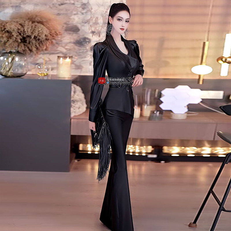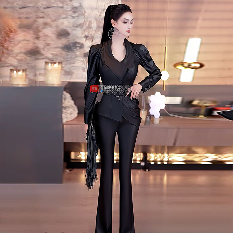 小众立体剪裁套装 欧美帅气泡泡袖 两件套2025春季 仿皮喇叭裤 衬衫