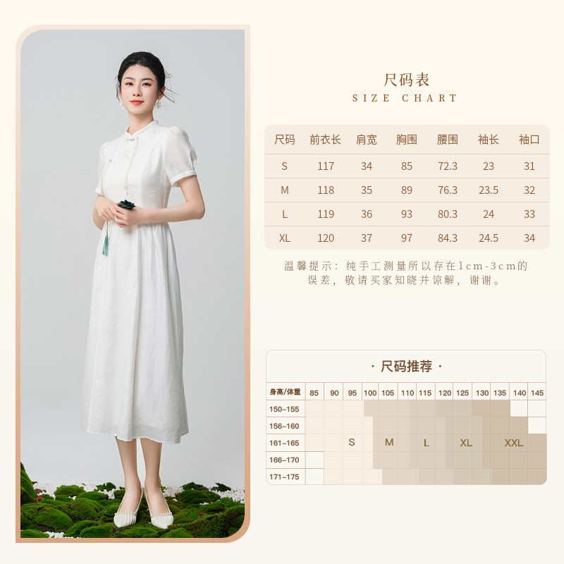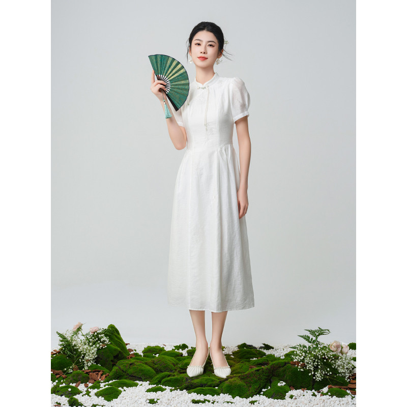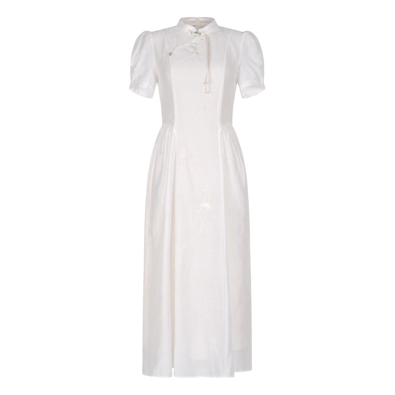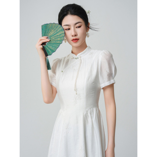 气质国风刺绣泡泡短袖 清冷感新中式 固执夏季 米白色连衣裙 特价