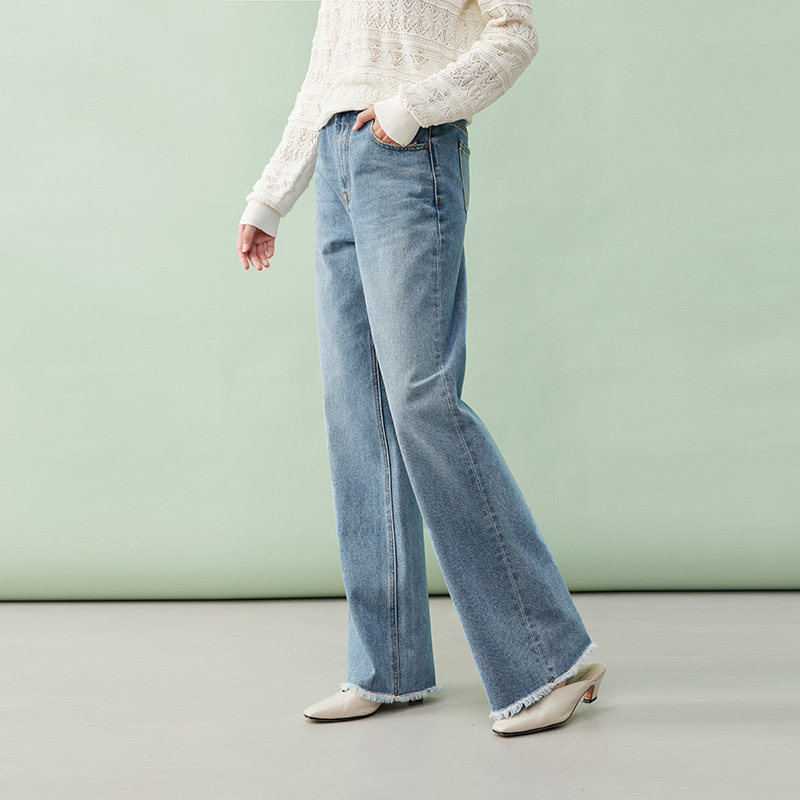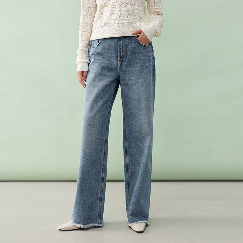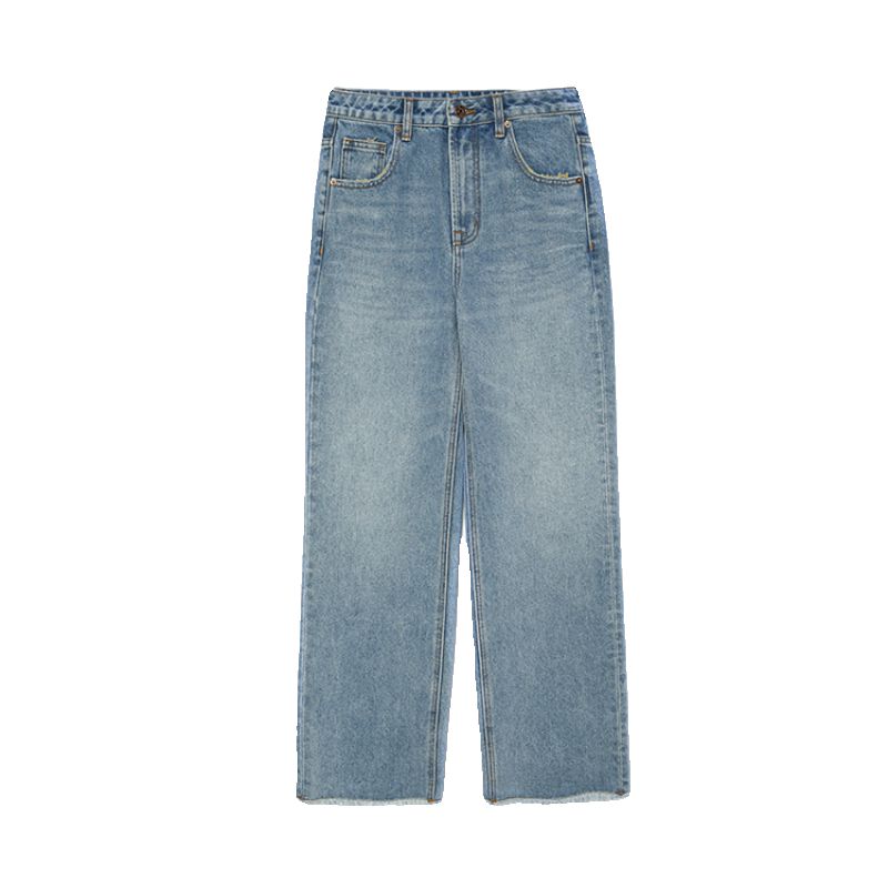 复古蓝手缝藏线西班牙棉牛仔脚口毛边直筒裤 茉莉雅集 WKZ06141