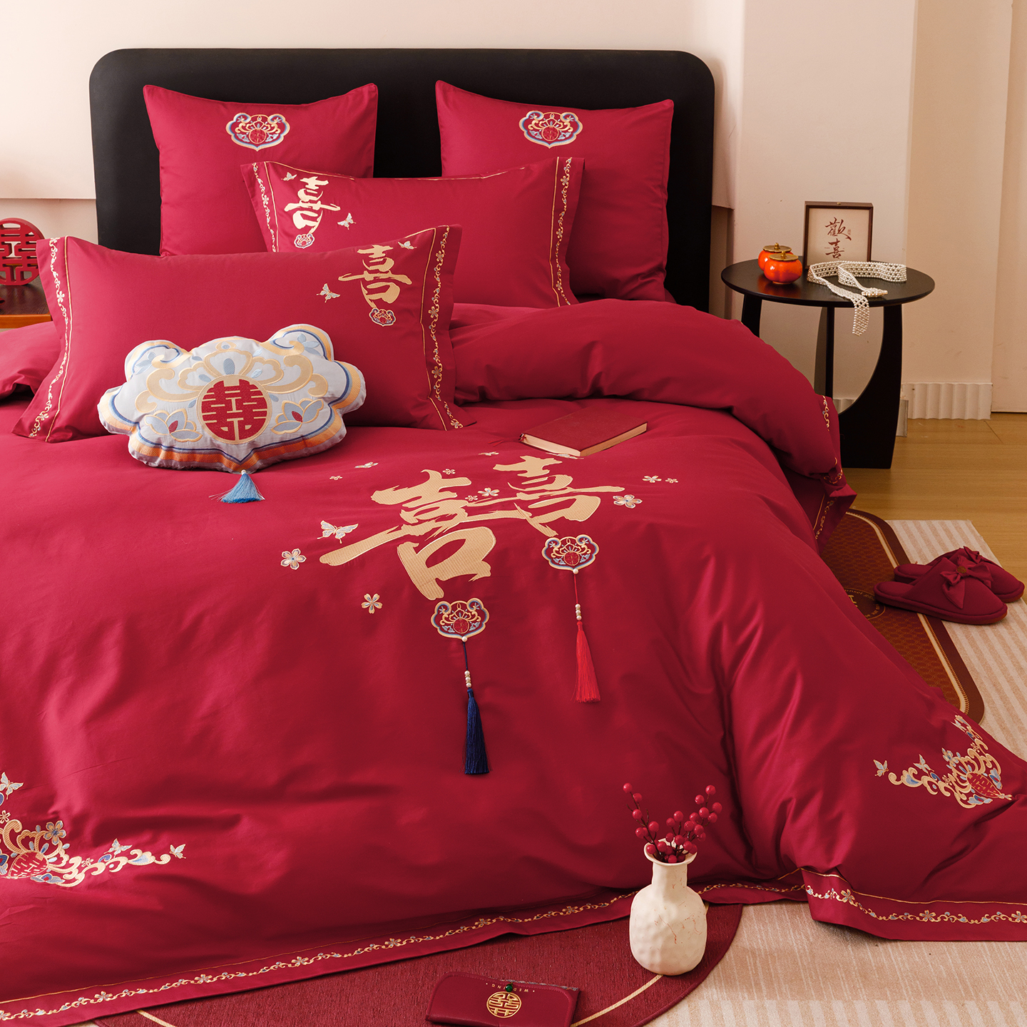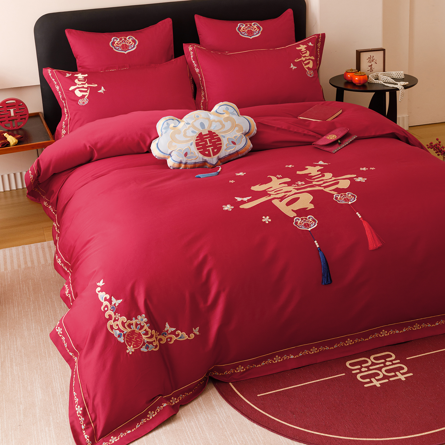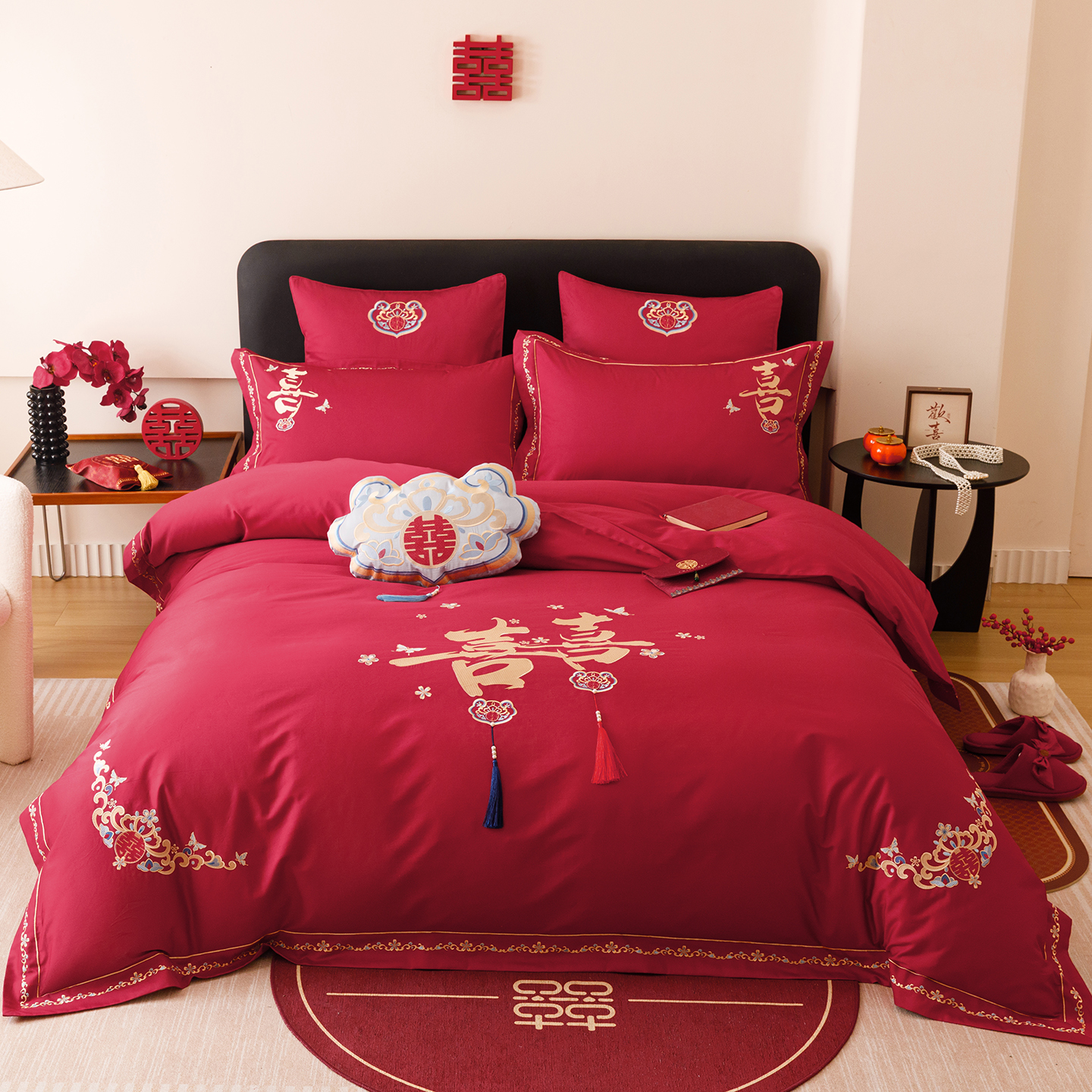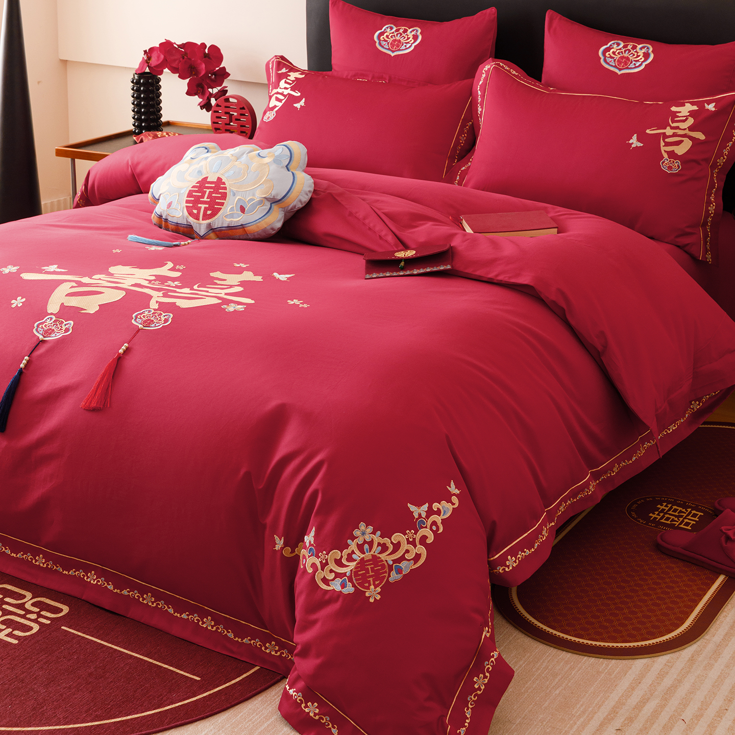 双喜临门中式 婚庆四件套100S长绒棉被套红色纯棉结婚喜被床上用品