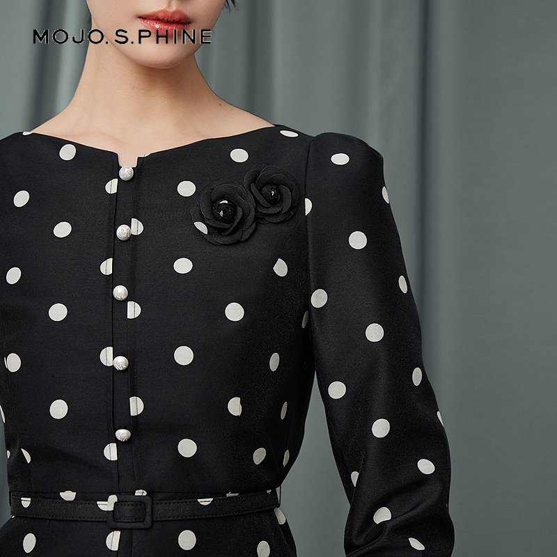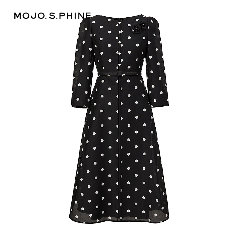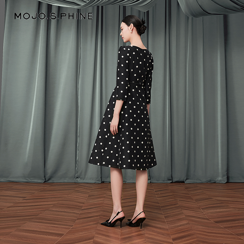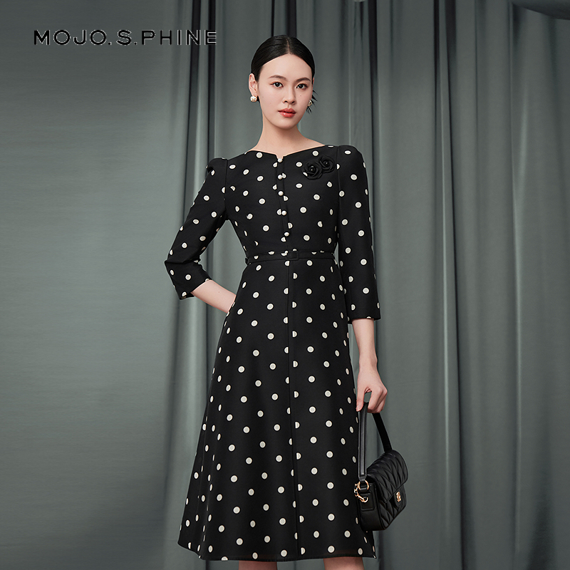 波点连衣裙女优雅高腰线收腰显瘦中长裙 法式 MOJO莫佐2025秋季 新款