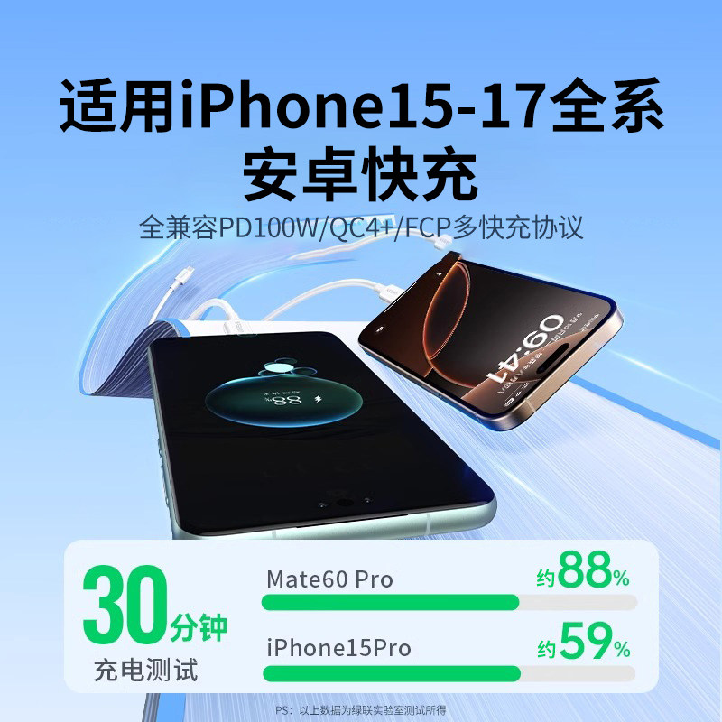 绿联双typec数据线ctoc适用iPhone17 16pro15安卓手机ipad平板电脑macbook充电线两头pd100w快充tpyec口