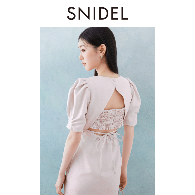 SNIDEL2025春夏新品 开叉连衣裙SWFO252302 优雅V领收腰露背泡泡袖