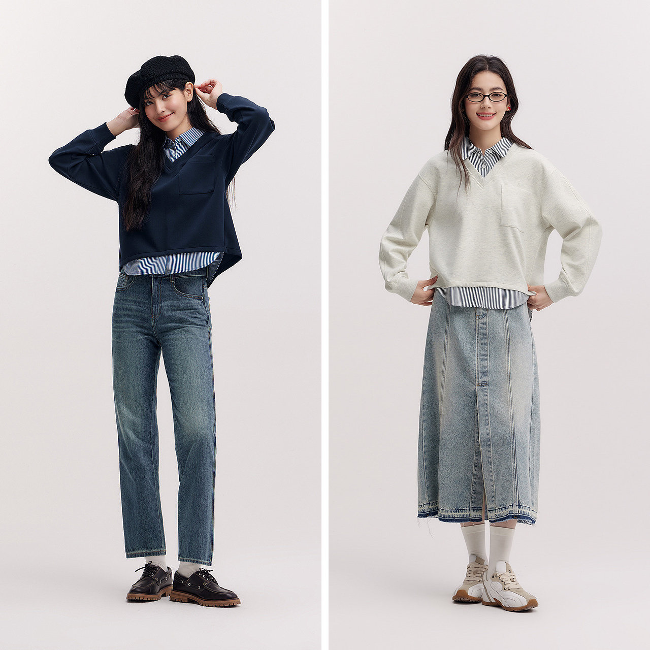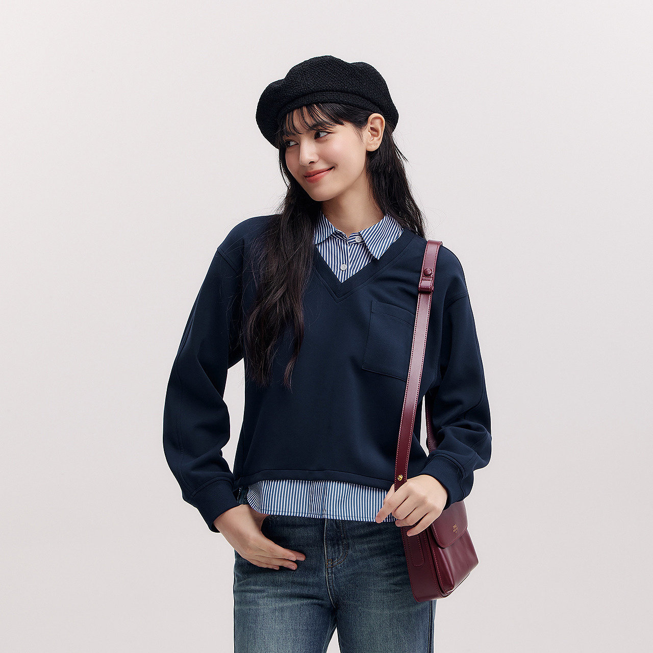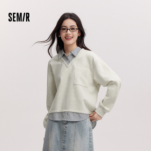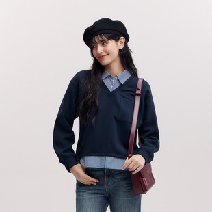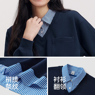假两件条纹宽松翻领开叉设计感气质衣服 短款 森柔 森马卫衣女春季