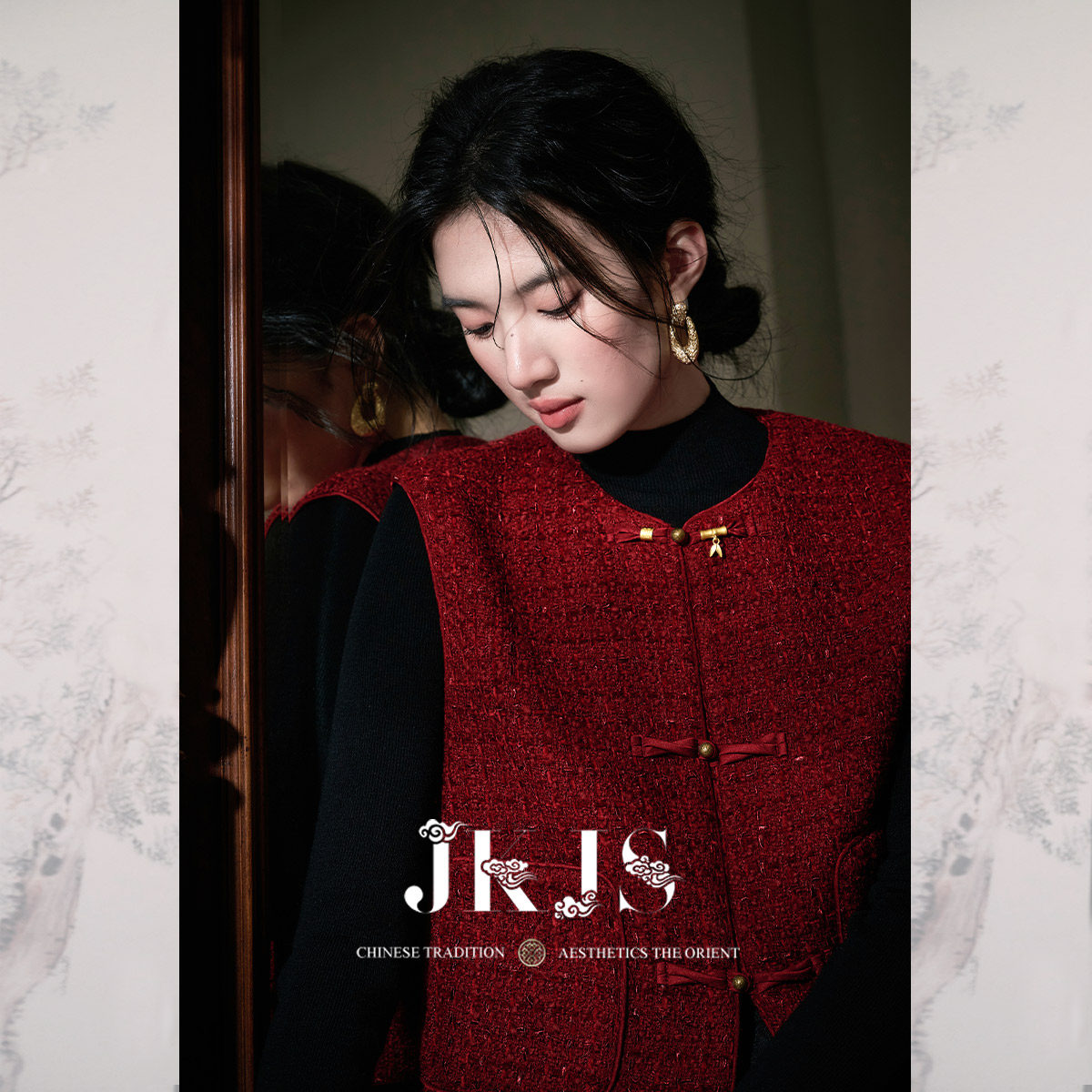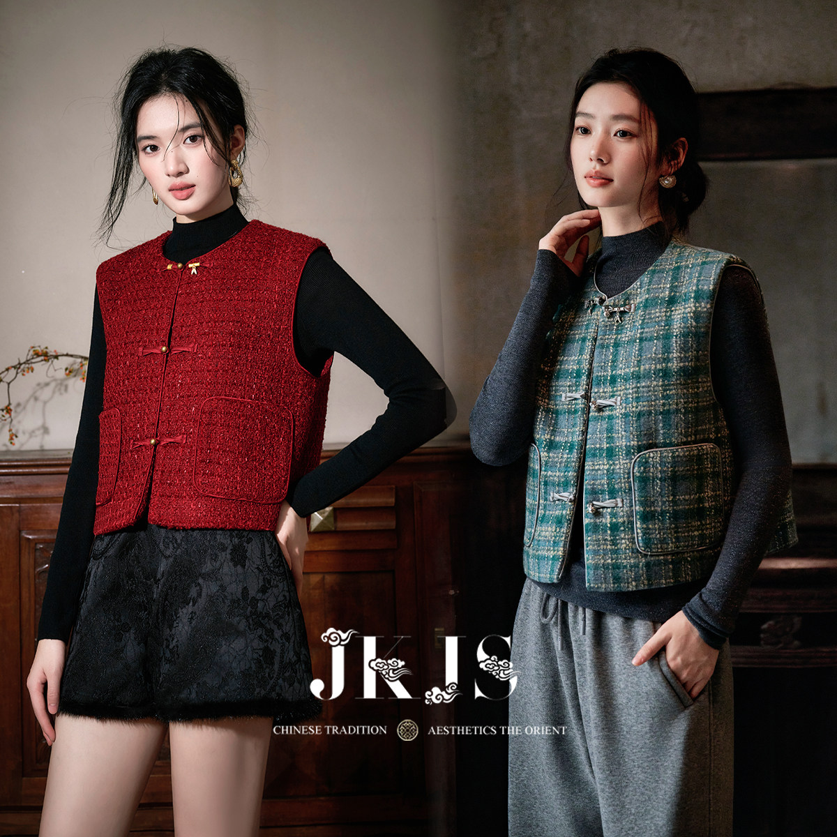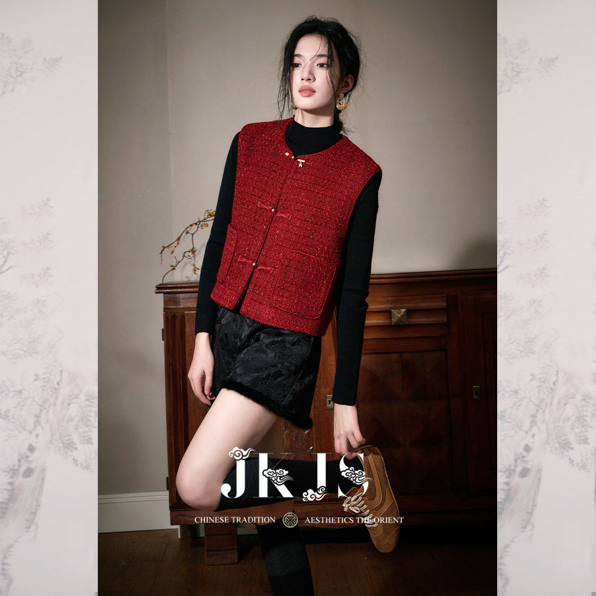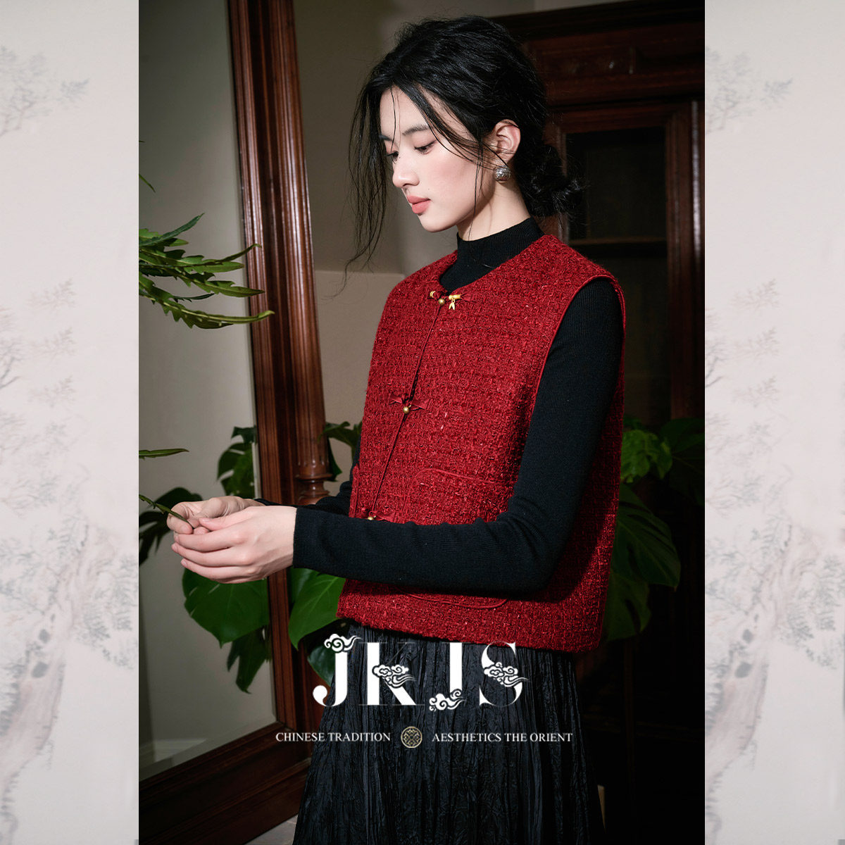 国风马夹背心时髦洋气新中式 羊毛粗花呢 盘扣马甲 醉红妆 JKJS