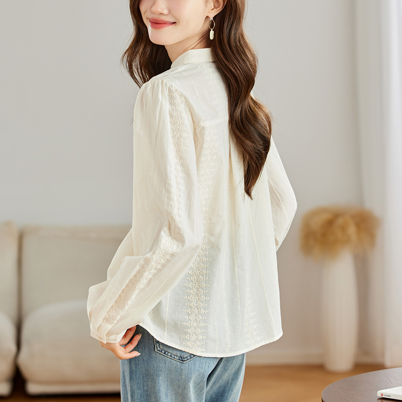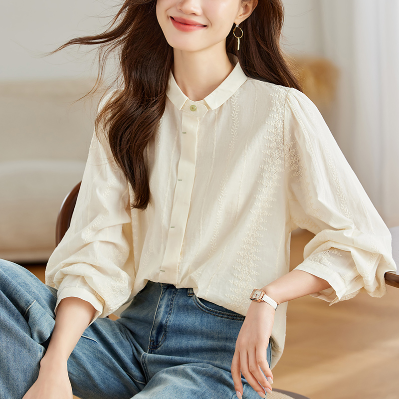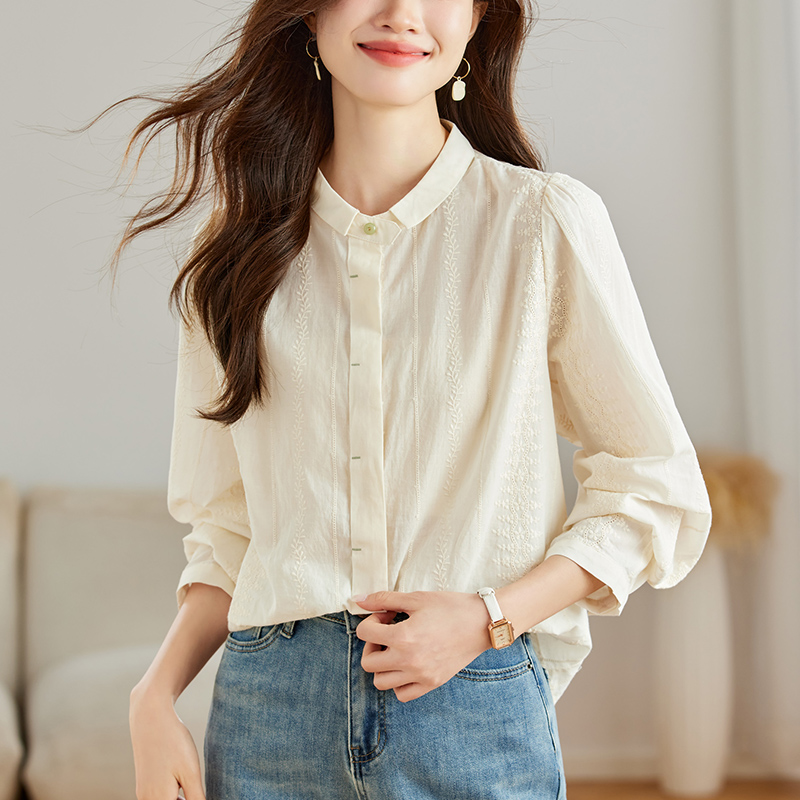 百搭气质上衣女 木耳领衬衫 仙草宝相提花缎真丝桑蚕丝白色法式 长袖