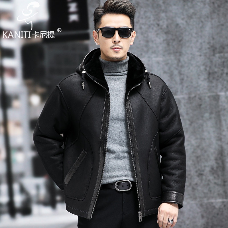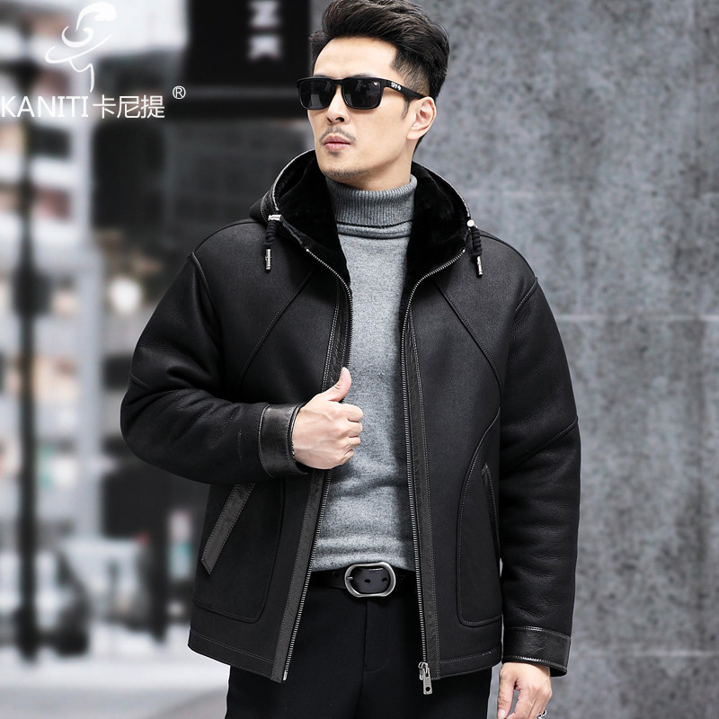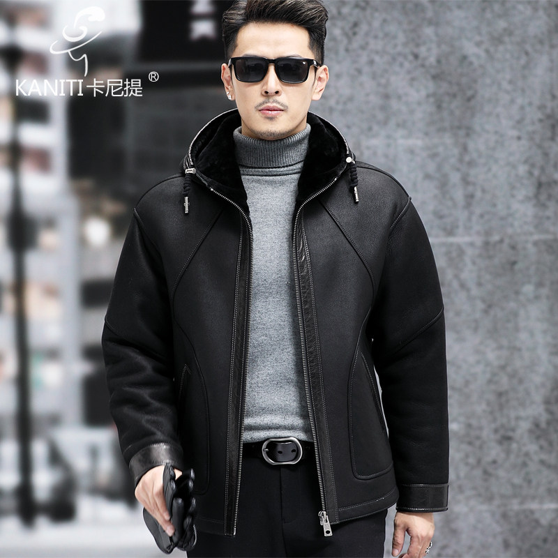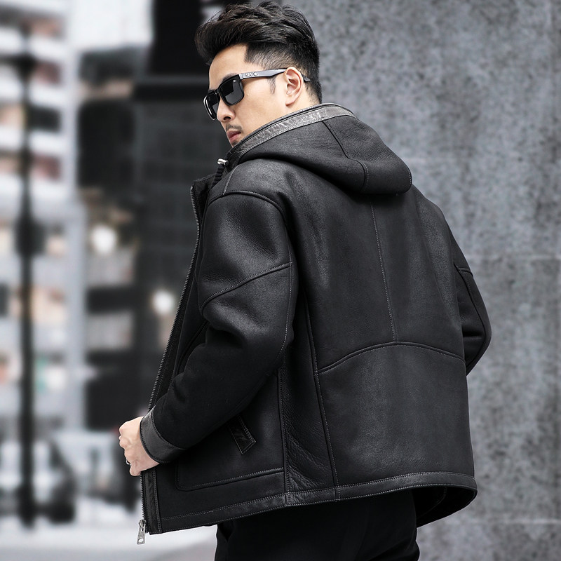美利奴羊皮毛一体男短款 保暖休闲外套 连帽真皮皮衣宽肩皮夹克厚款