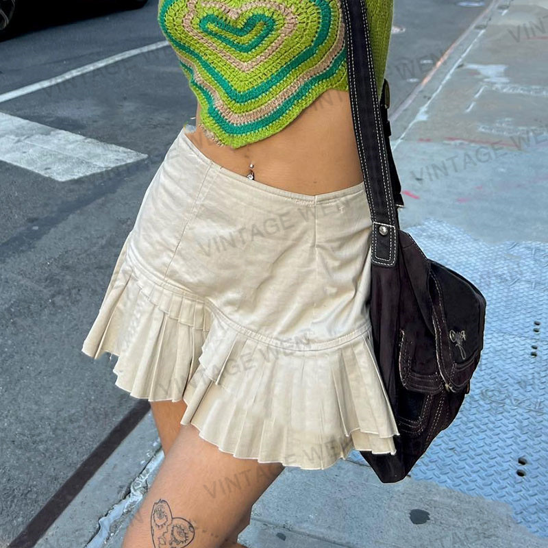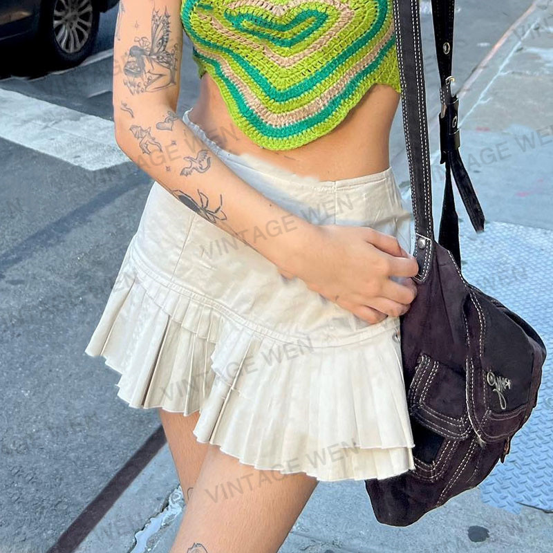 女简约 复古拼接学院风高腰百褶半身裙短裙夏季 Vintage Wen美式