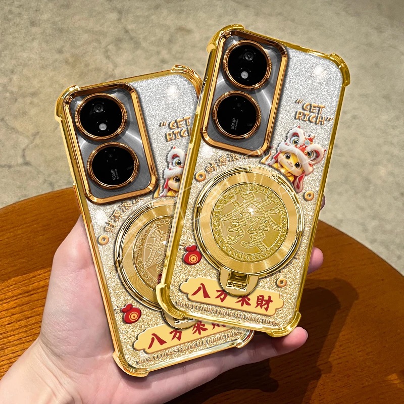 蛇年八方来财适用荣耀畅玩畅玩50plus手机壳新款 金色电镀四角防摔防摔气囊發字旋转解压陀螺支架手机套女