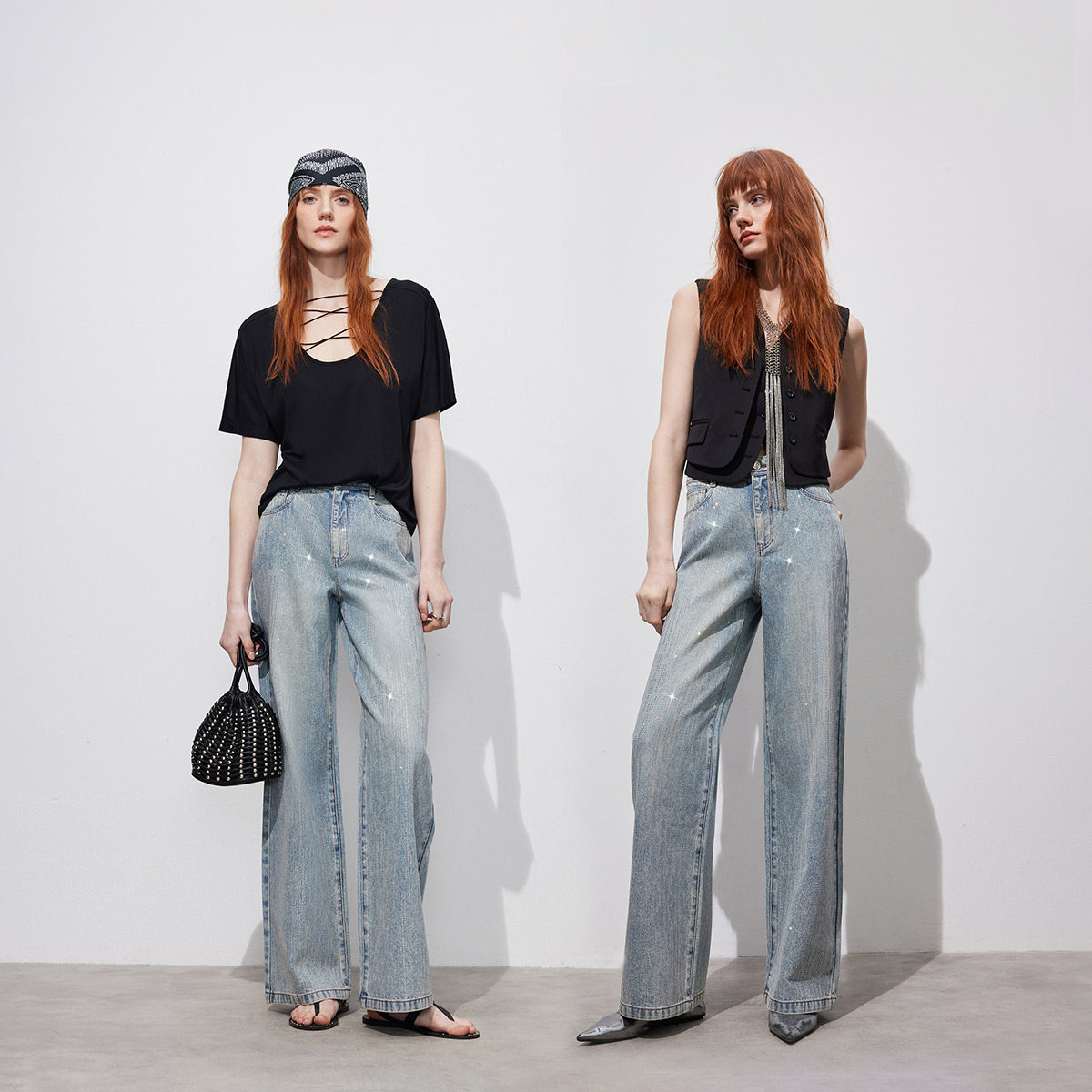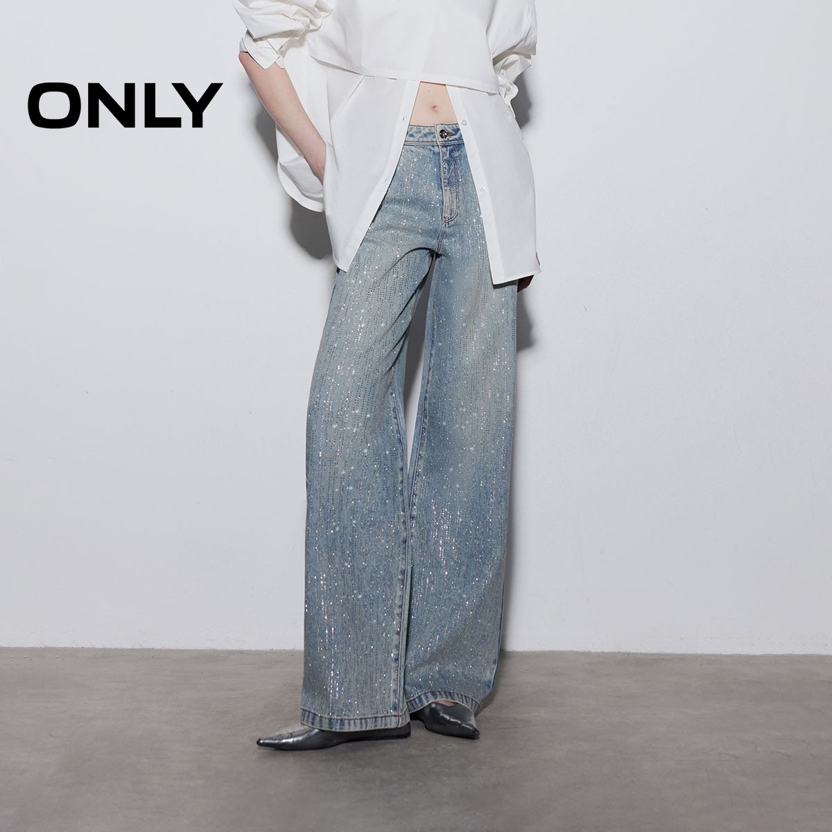 新款 ONLY2026春季 流星裤 面料升级烫钻高腰宽松直筒牛仔裤 爆款