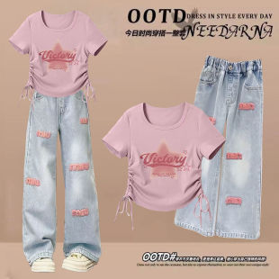 女童套装 牛仔阔腿裤 韩版 中大童抽绳上衣T 潮流网红两件套 新款 夏季
