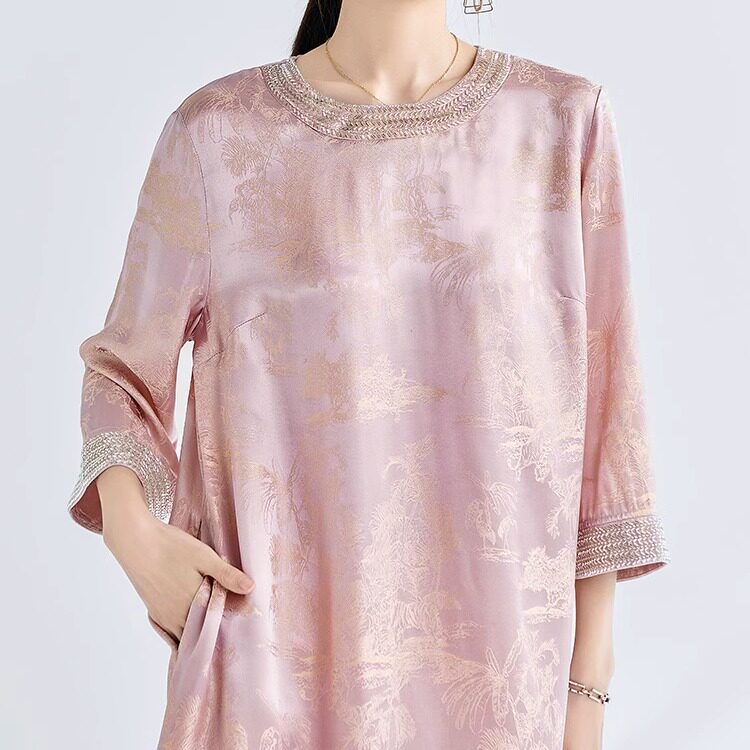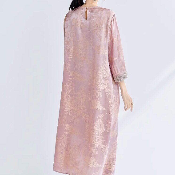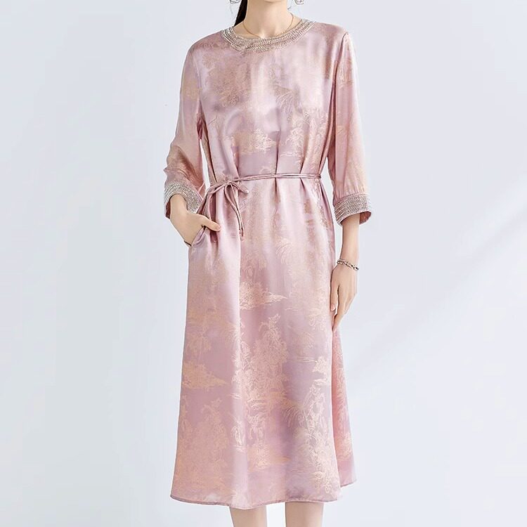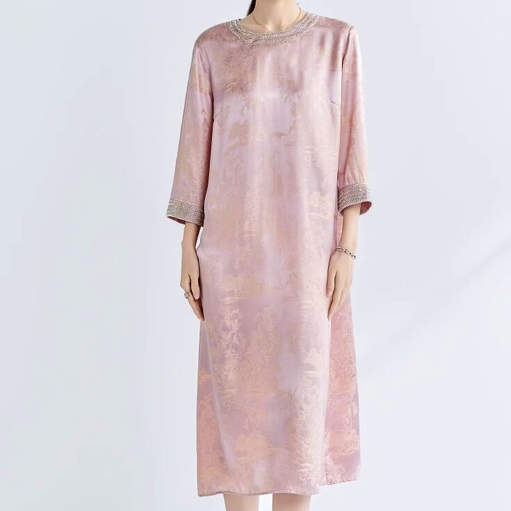 大码 婚宴妈妈装 高档真丝旗袍桑蚕丝高端粉色连衣裙气质中长款 新款