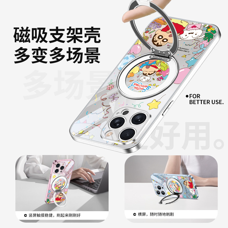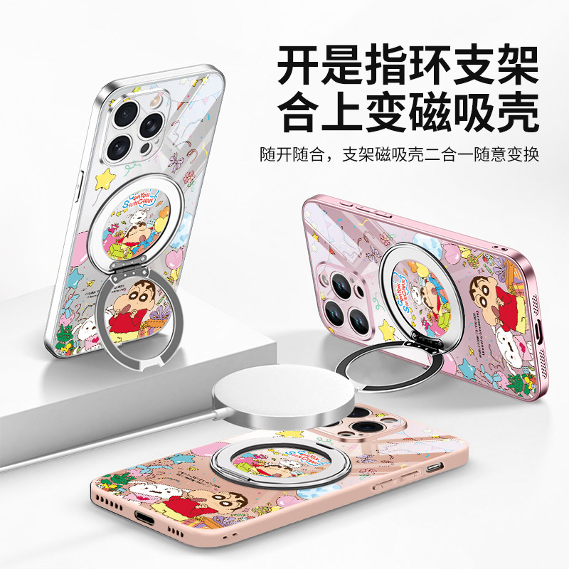 适用苹果16pro手机壳17磁吸带支架iPhone15支点14plus蜡笔小新13promax新款 360度旋转12magsafe指环扣小米套