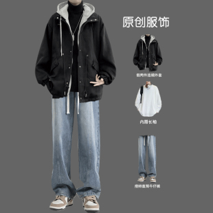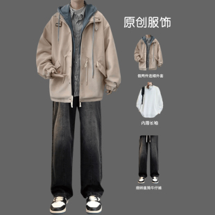 假两件夹克男秋冬宽松连帽毛呢外套韩版 ins潮流三件套穿搭牛仔裤