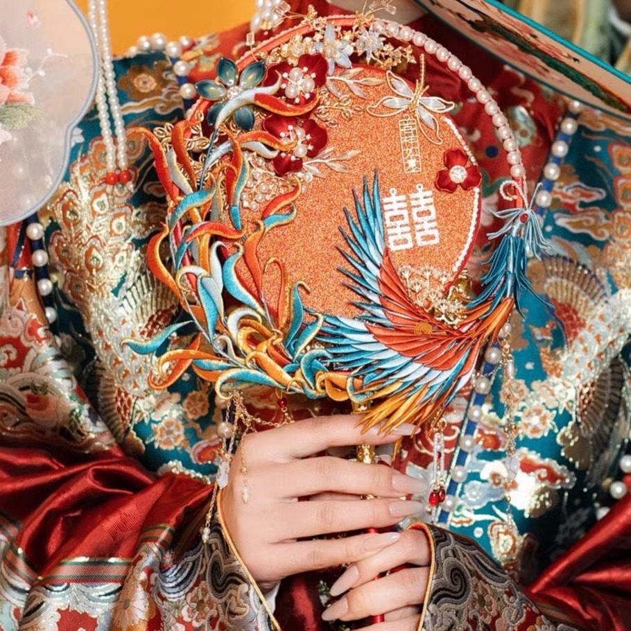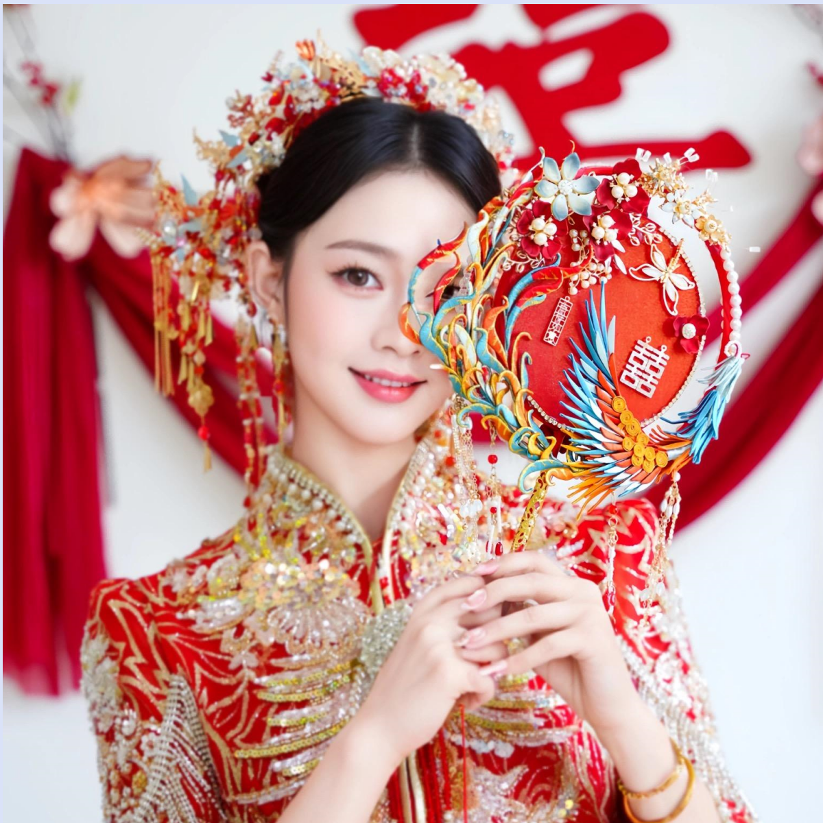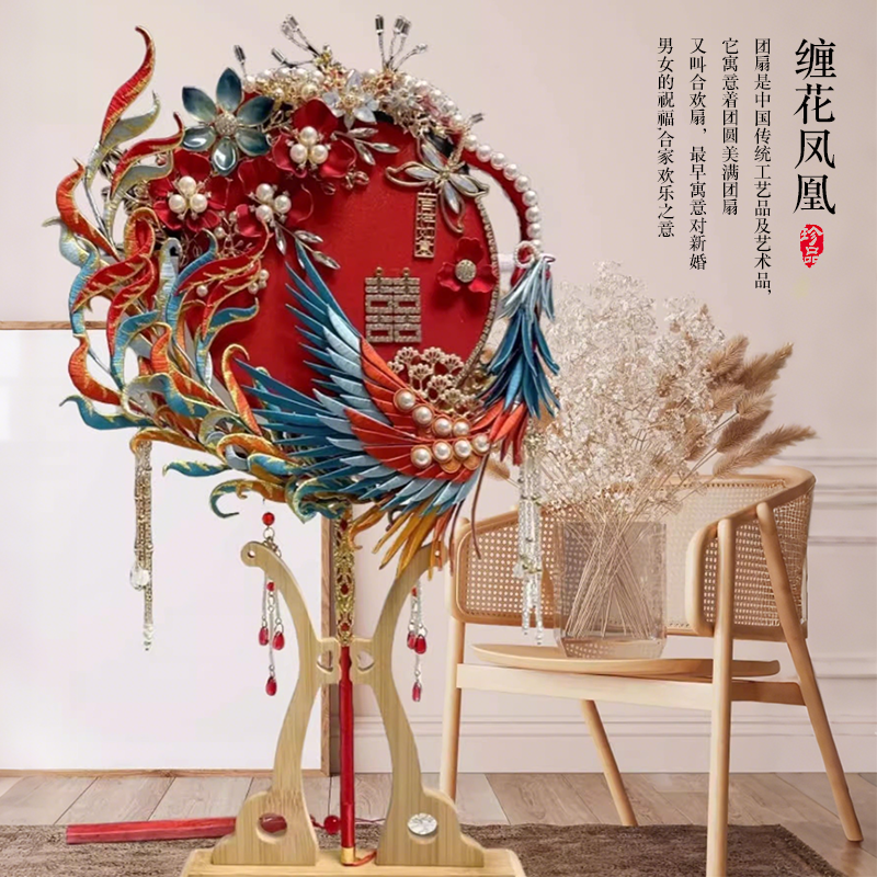 岚尚宫非遗缠花diy凤凰团扇新娘结婚扇成品中式 婚扇秀禾手工喜扇