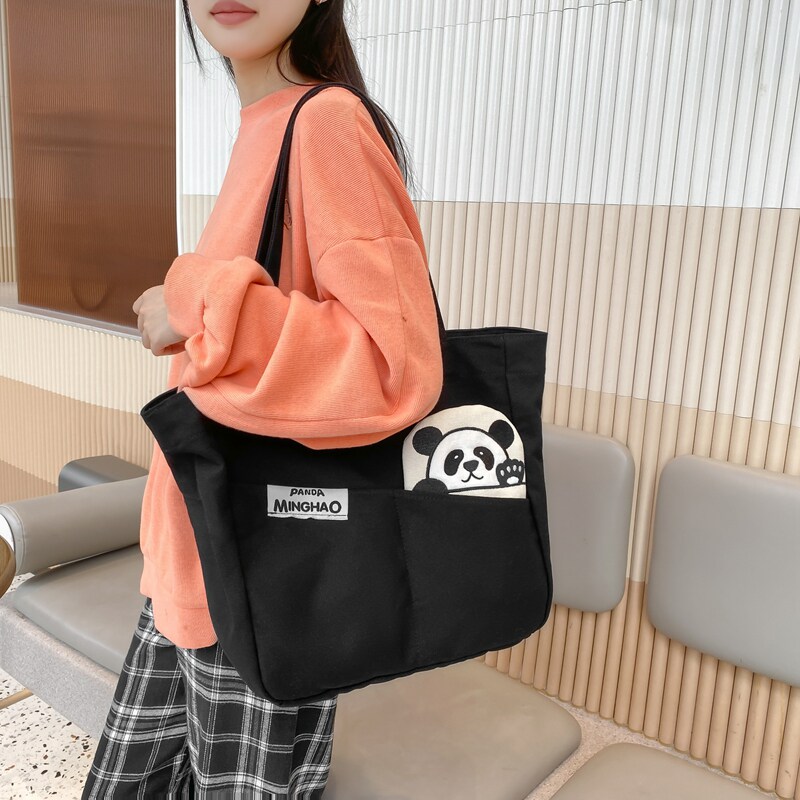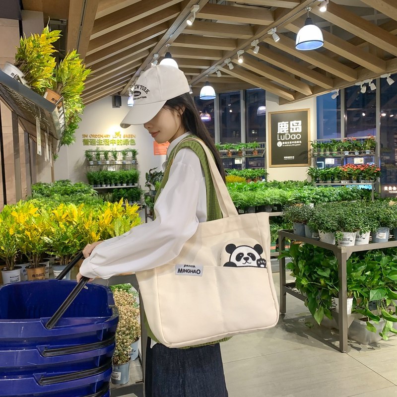 熊猫帆布包女大容量百搭单肩包手提拎书袋大学生上课包通勤托特包