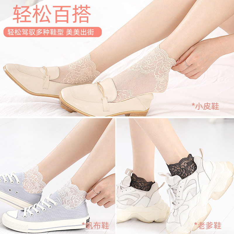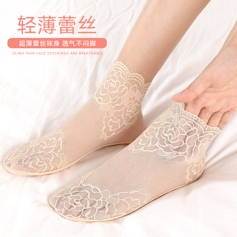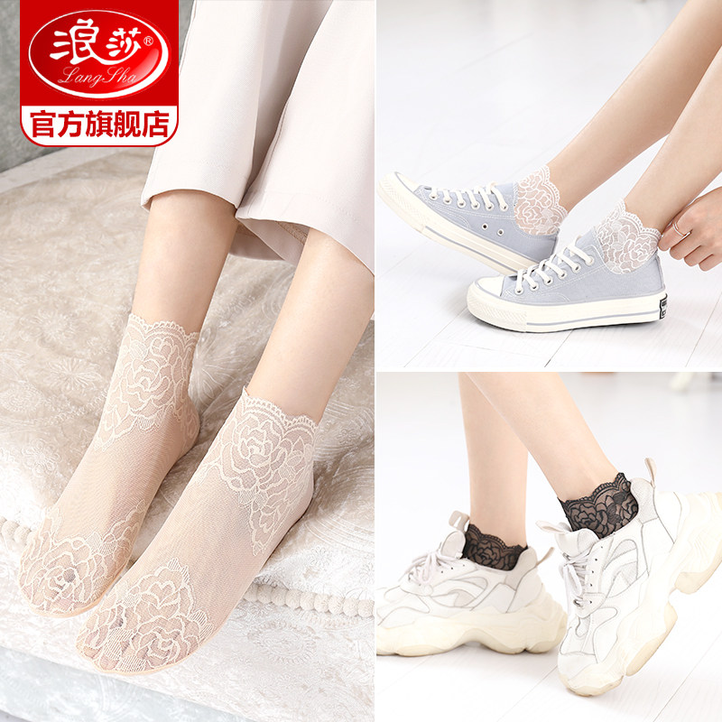 浪莎蕾丝袜子春夏薄款 纯棉底浅口隐形短袜 短丝袜女士花边网纱夏季