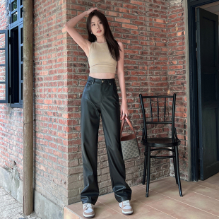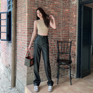 显瘦软软高腰阔腿休闲裤 长裤 女秋冬垂感窄版 黑色pu皮宽松直筒皮裤