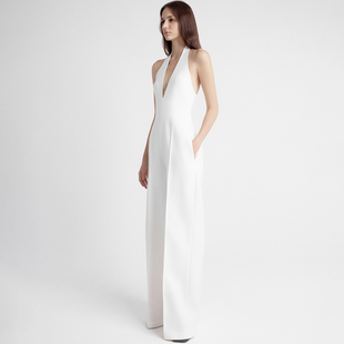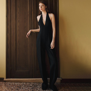 知觉之门高级感v领挂脖白色露背高端气场强大黑色连体裤 女夏