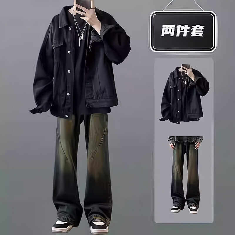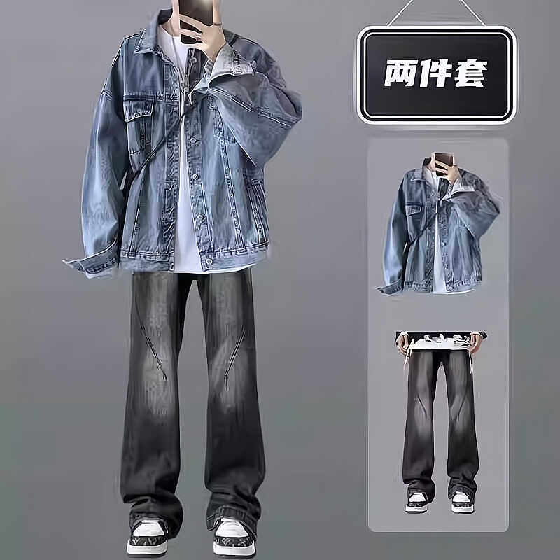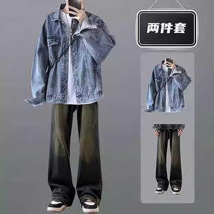 一套搭配潮流 加绒加厚夹克男装 春秋牛仔外套男生套装 潮牌休闲冬季