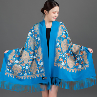 绣花围巾羊绒披肩红色女秋冬时尚 民族风刺绣保暖披巾外搭 妈妈长款