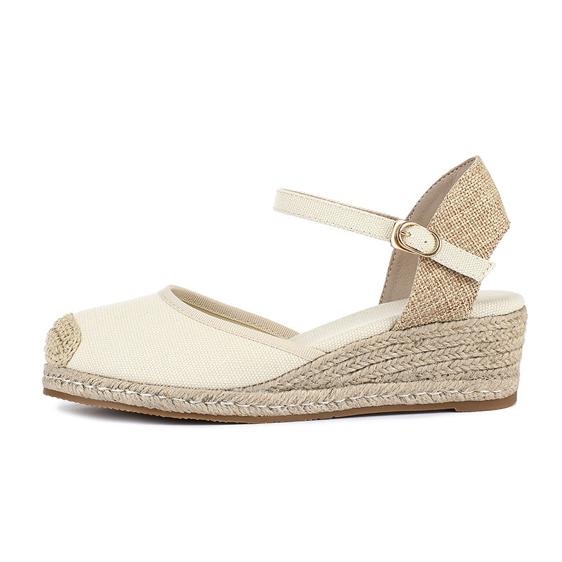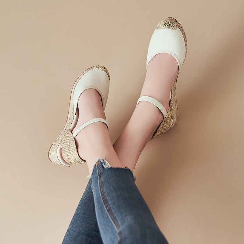 女 坡跟增高透气厚底帆布渔夫凉鞋 夏季 小香风草编包头粗跟高跟法式