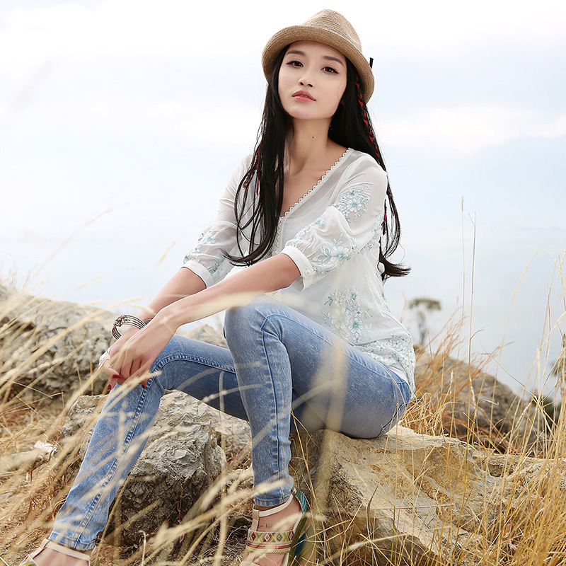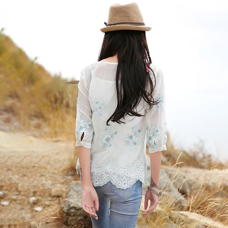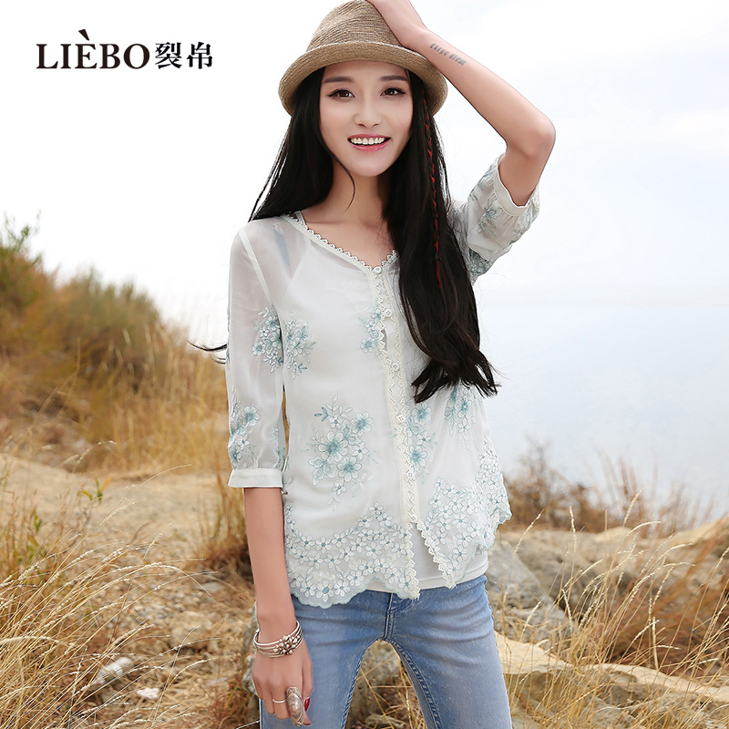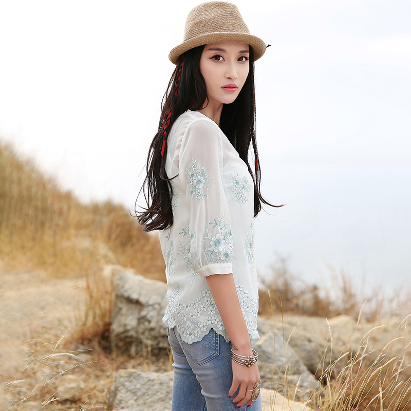 折扣款 裂帛刺绣薄荷曼波V领花边下摆简约百搭夏衬衫 上衣清仓特价