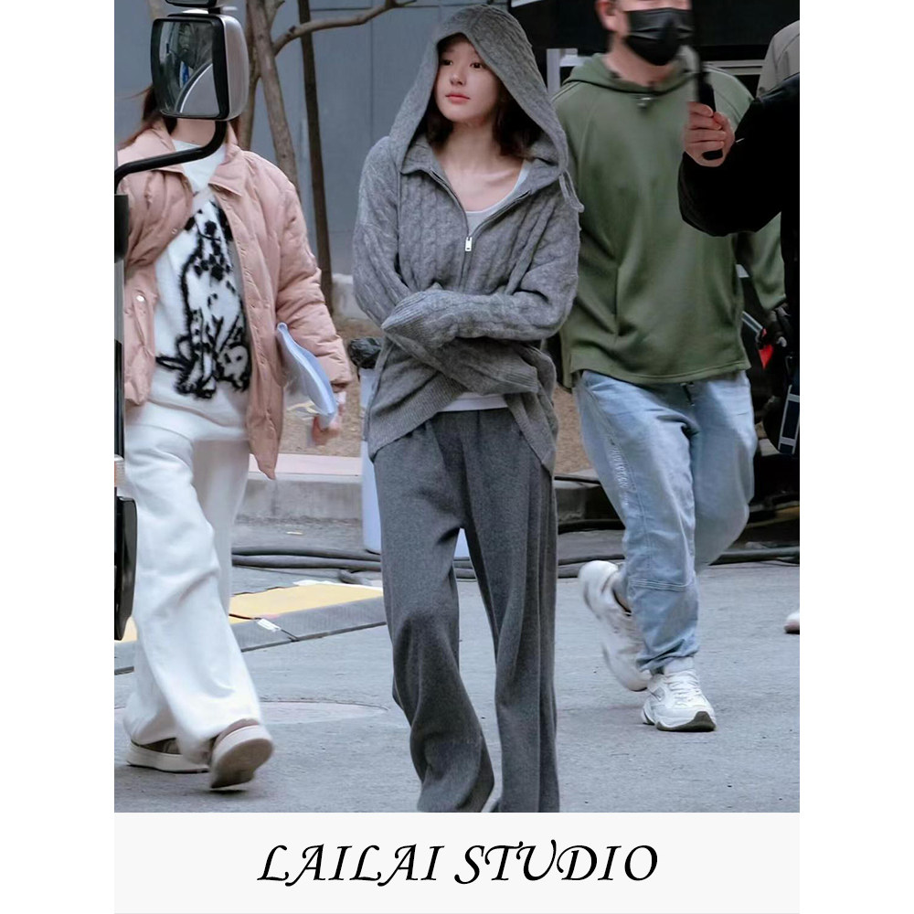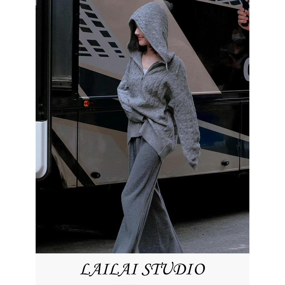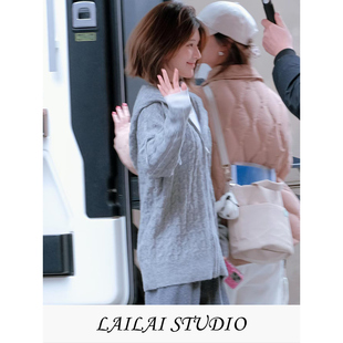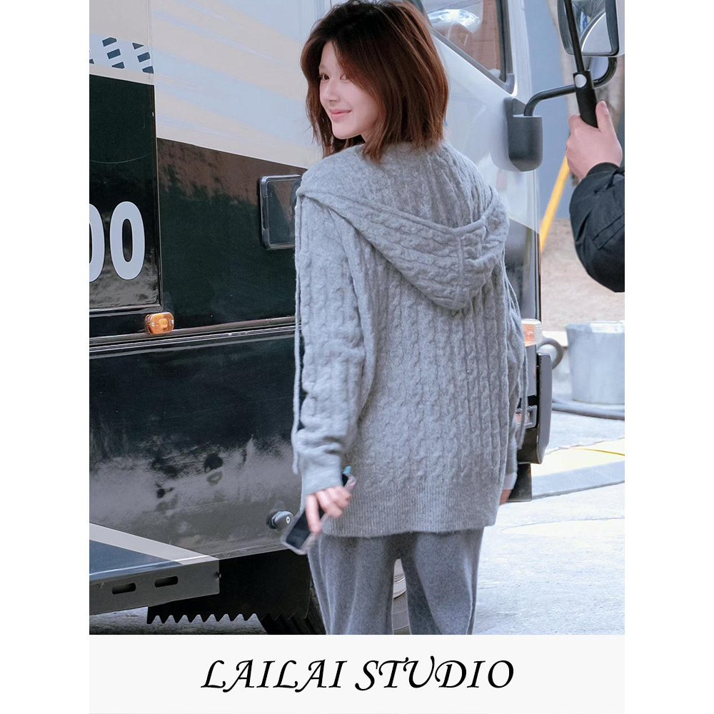 慵懒风连帽拉链外套女秋冬新款 灰色软糯毛衣宽松麻花百搭针织开衫